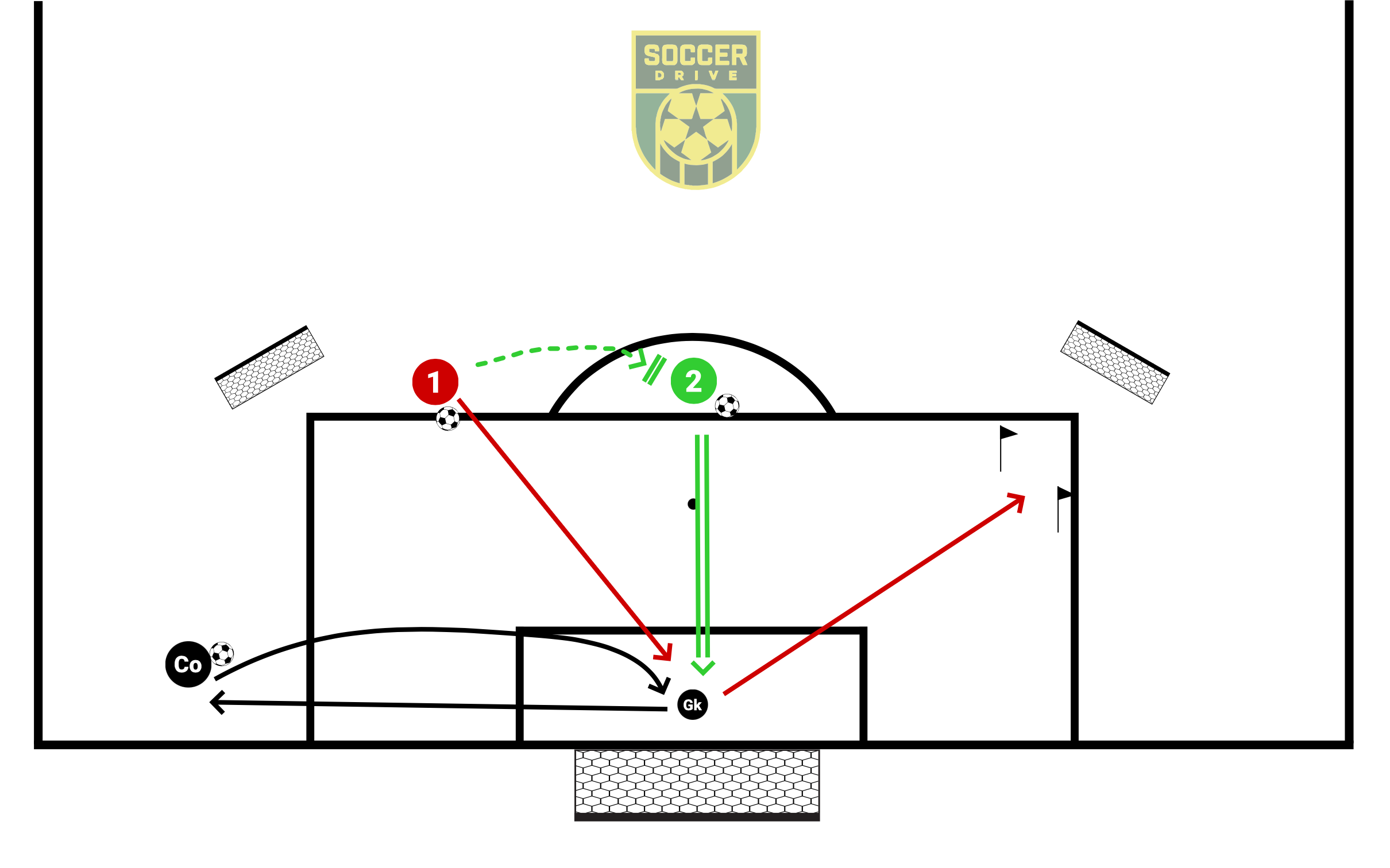 One goalkeeper in the goal, coach on the side of the box for the high ball/cross , other goalkeeper on top of the 18 yard line to pass and shoot. The goalkeeper asks for the ball from player 1 at the top of the box then receives the pass, opens up and passes the ball to the pug goal or gate on the opposite side. After the pass, the goalie immediately goes to the center of the goal to deal with a shot from server 1 who dribbles to position 2 for a shot. The goalkeeper rolls the ball back to the shooter and quickly finds the right position to deal with the high ball from the coach. After catching the high ball, distribute the ball into one of the two small goals.
