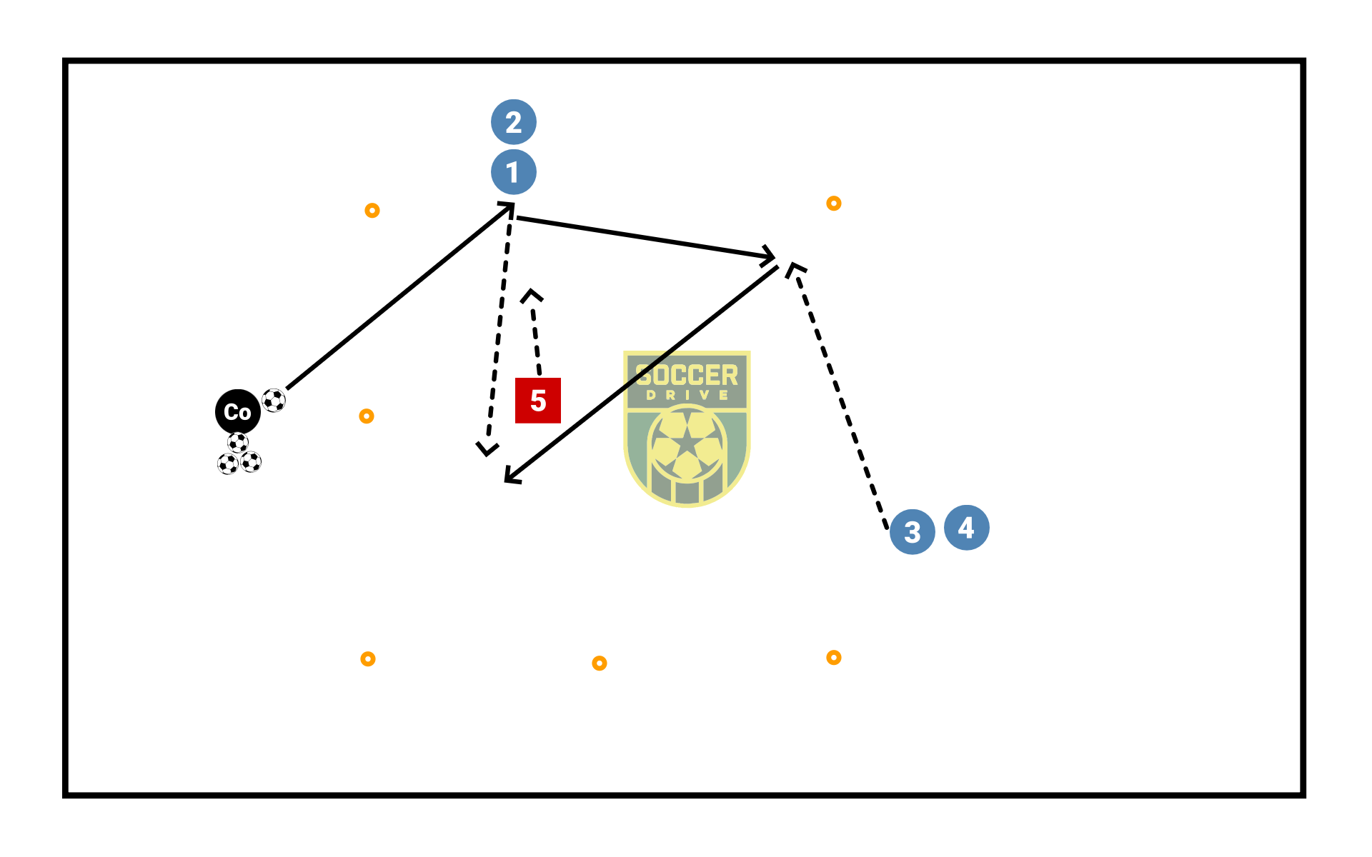 The purpose of this drill is turning 1v1s into 2v1s. Every time we can overload a defender, we turn the odds in our favor. The coach plays the ball into player 1. As soon as 1 receives the ball, the defender (5) is able to release and go after the ball. When 5 releases, 3 should recognize that 1 will be in a 1 v1 and run to a wide position to help keep possession. It is now on player 3 to read the 2v1 and see where there advantage lies. The preference is to one touch pass behind the defender for 1 to run on to and dribble through the gate. In the event the defender does not move toward the pass, 3 should carry the ball as far as they can