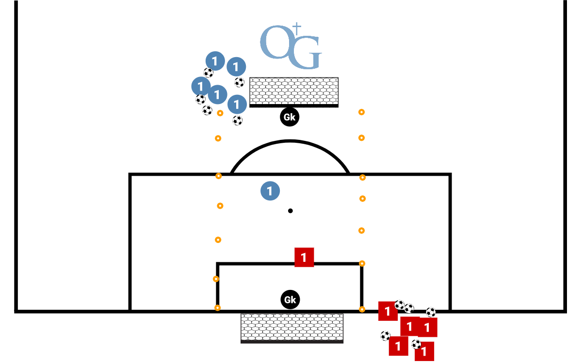 shot, out of bounds or over goal line. Next player in line starts to dribble. Defender drops off, attacker becomes defender.