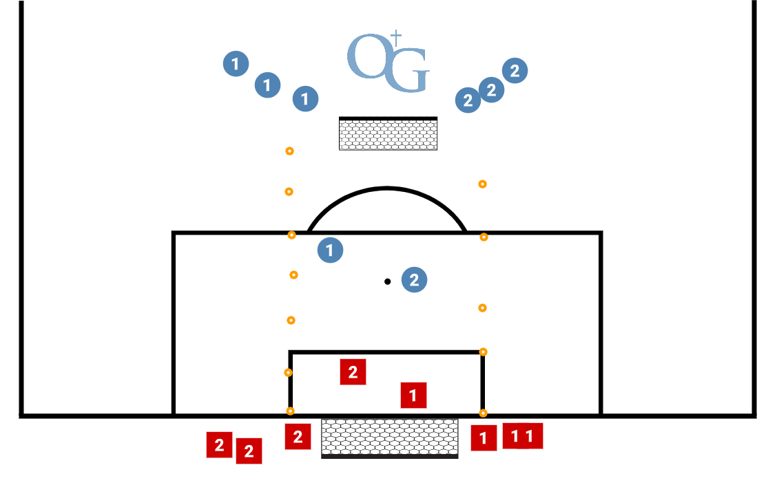 shot, out of bounds or over goal line. Next player in line starts to dribble. Defenders drops off, attacker becomes defender