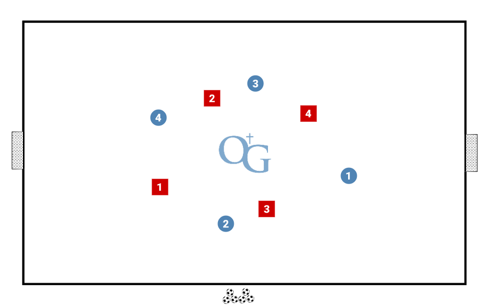 20 x 30 field. play 4 v4 3 minute games 4 teams of 4
