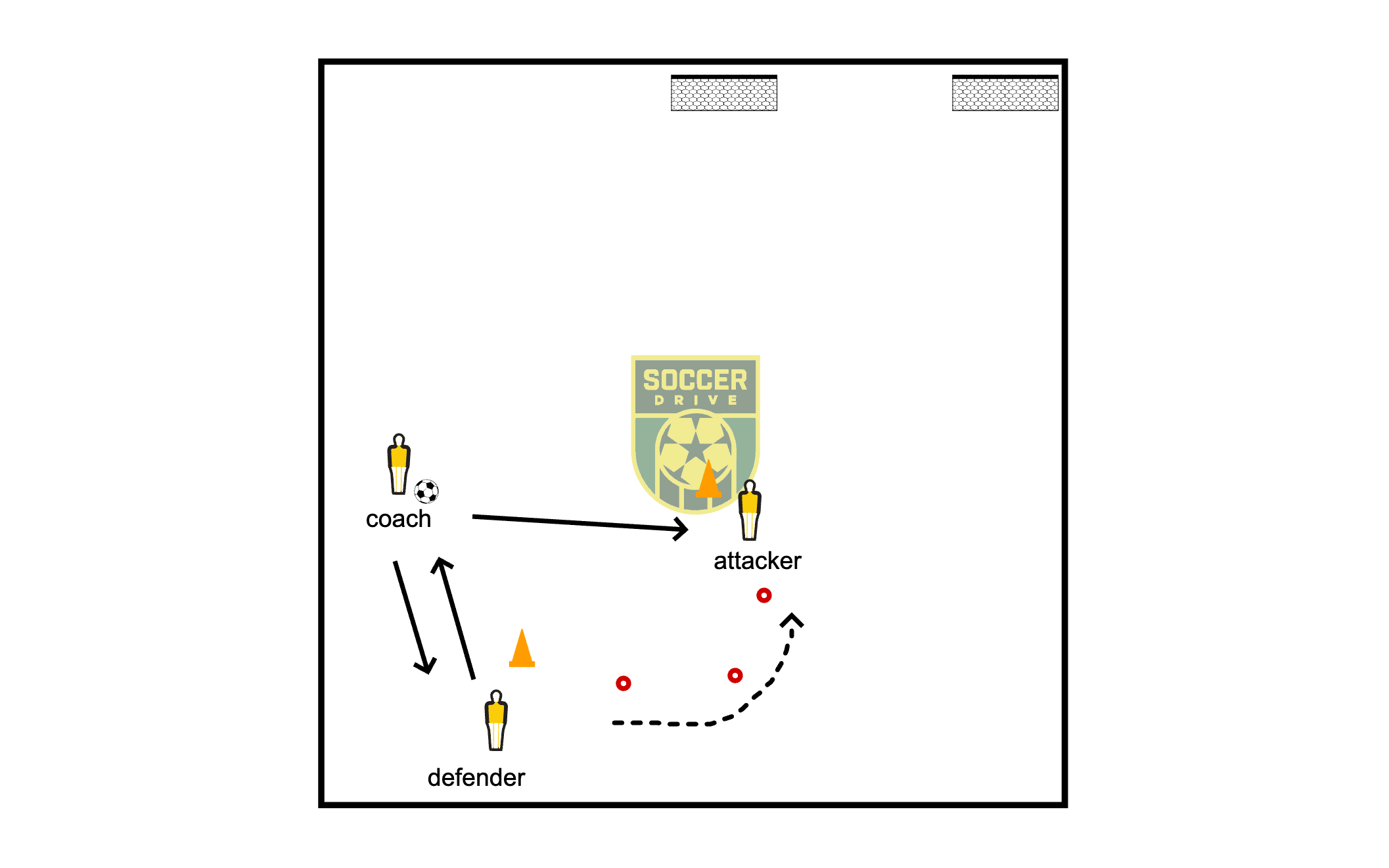 The focus of this drill is for the attacker to have a good touch. The drill will turn into a 1v1 if the attacker has a bad first touch.