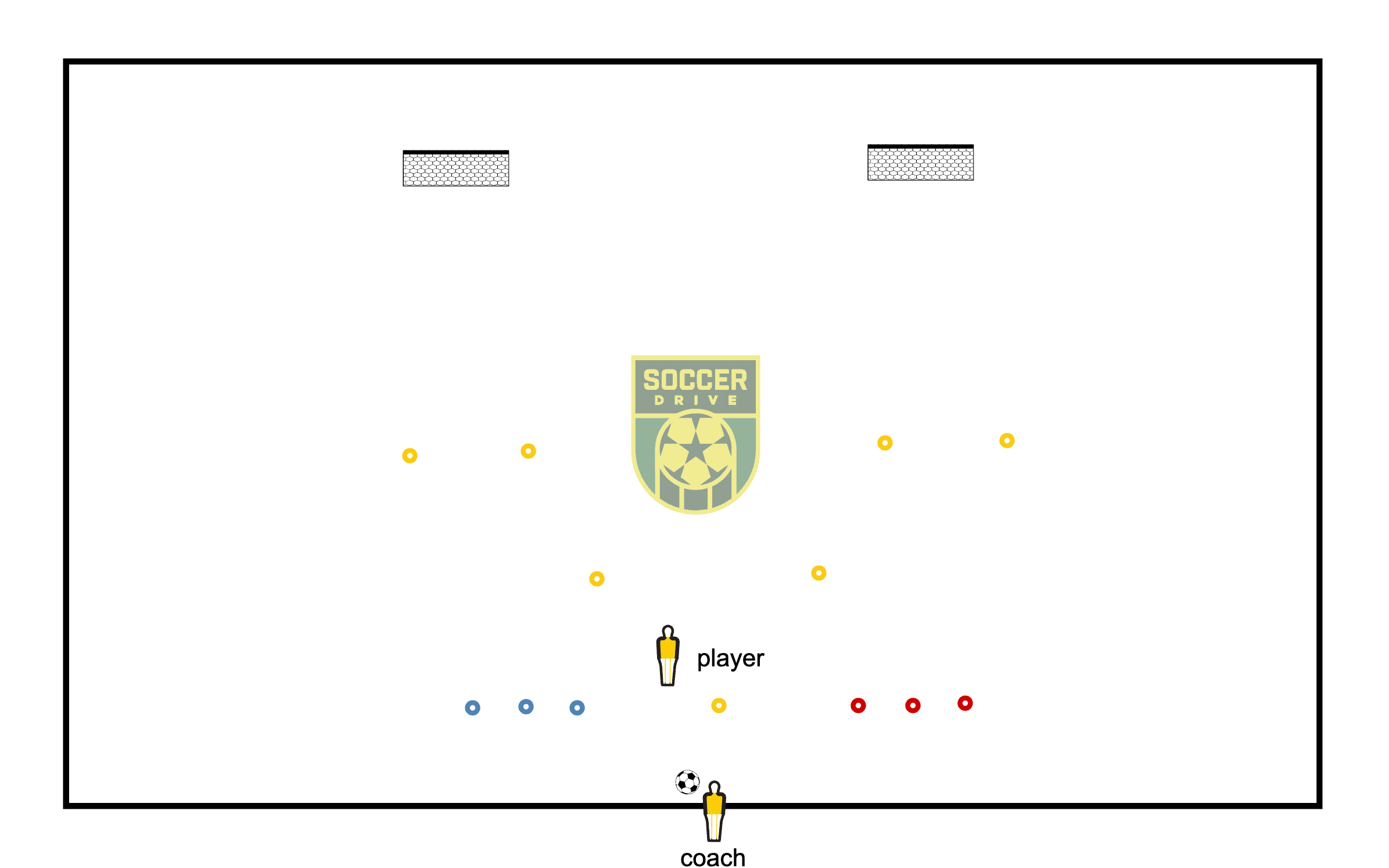 P1: one touch passes at yellow cone/ sideways high knees/ open up dribble croqueta at gate