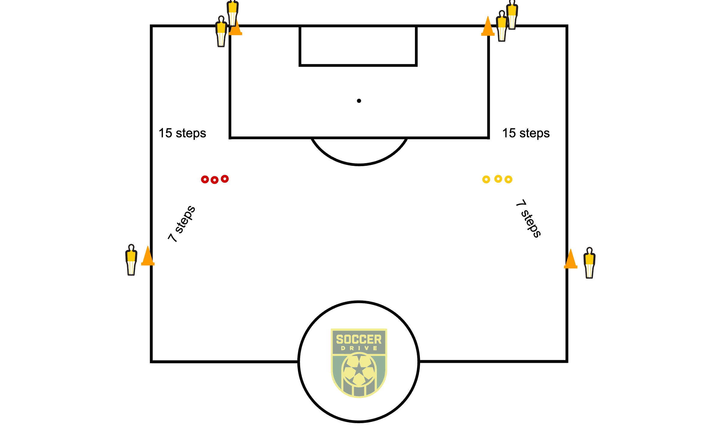 7 steps distance between the top tall cones and the small cones