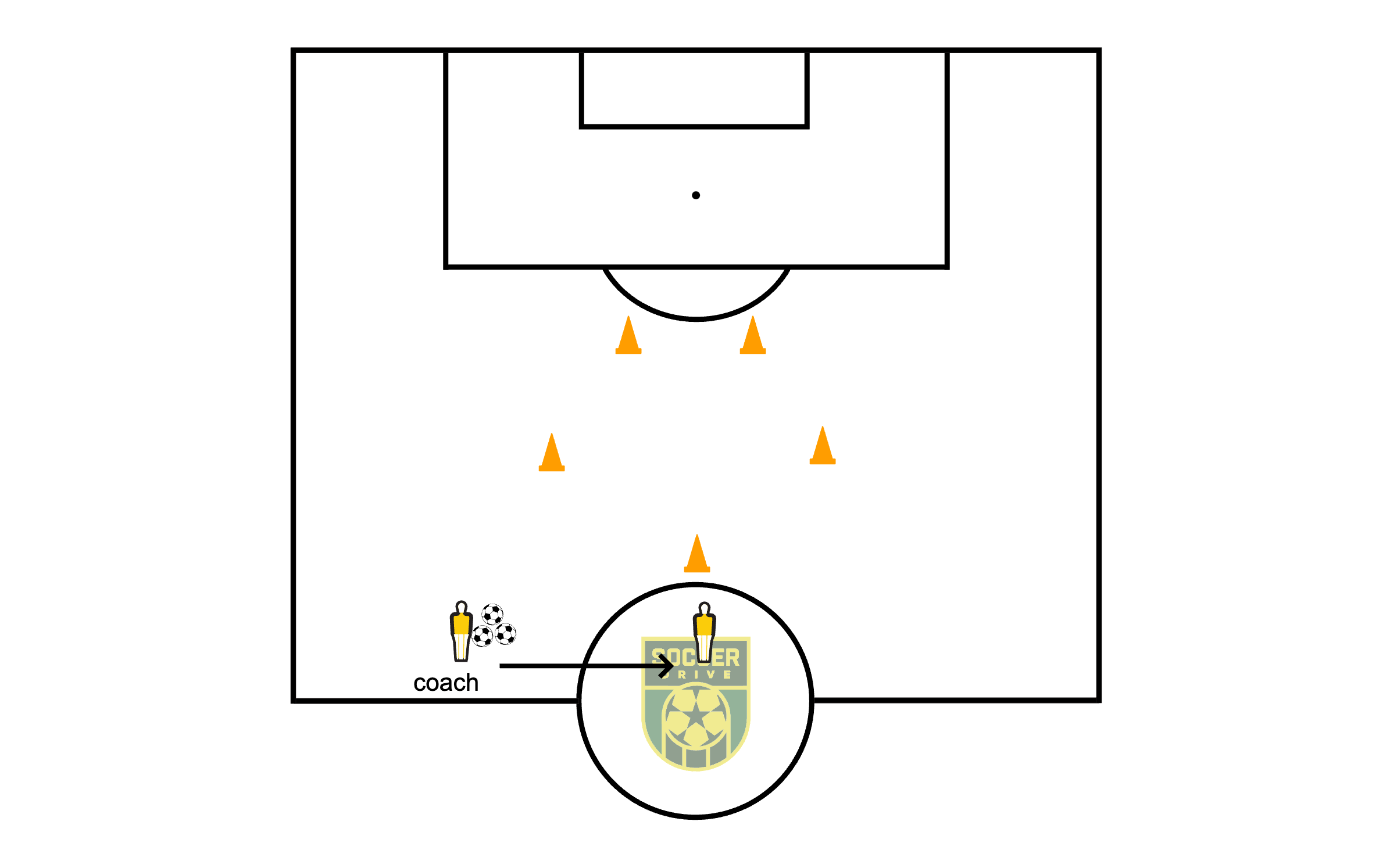 The player will perform different feints and skills at the cone, find an open space to get through, and then shoot the ball.