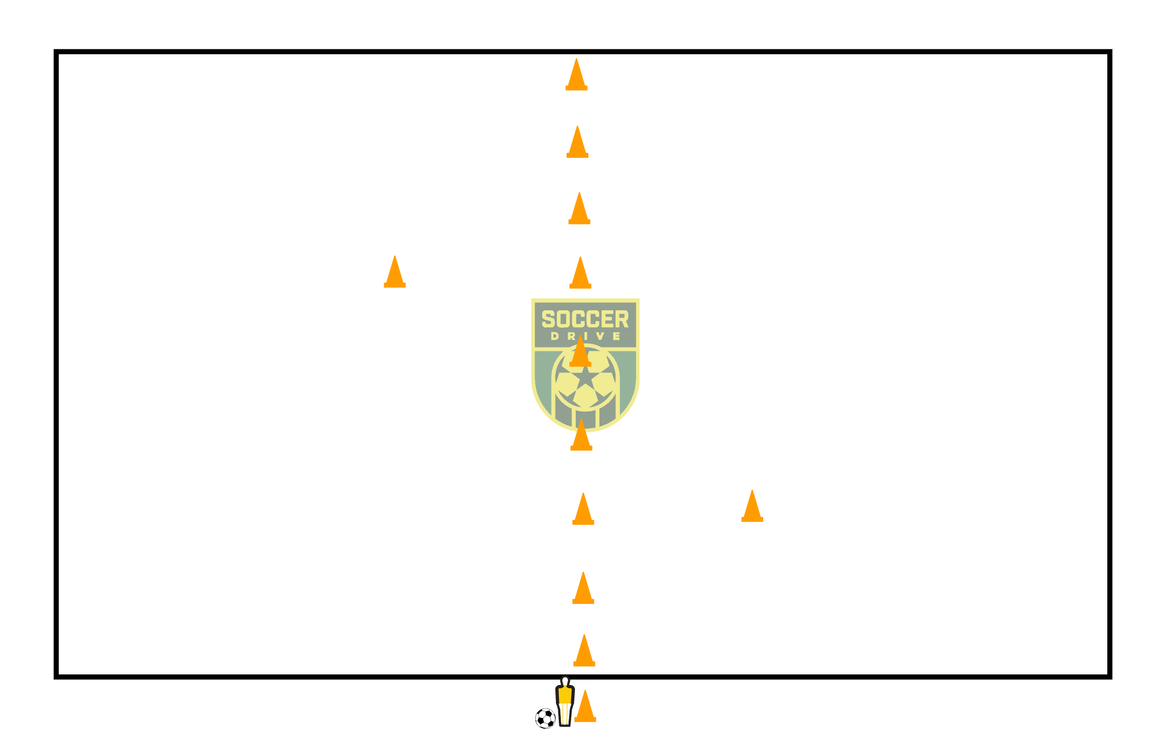 The player will perform a footwork pattern through the cone weave. After the fourth cone, they will dribble around the offset cone.