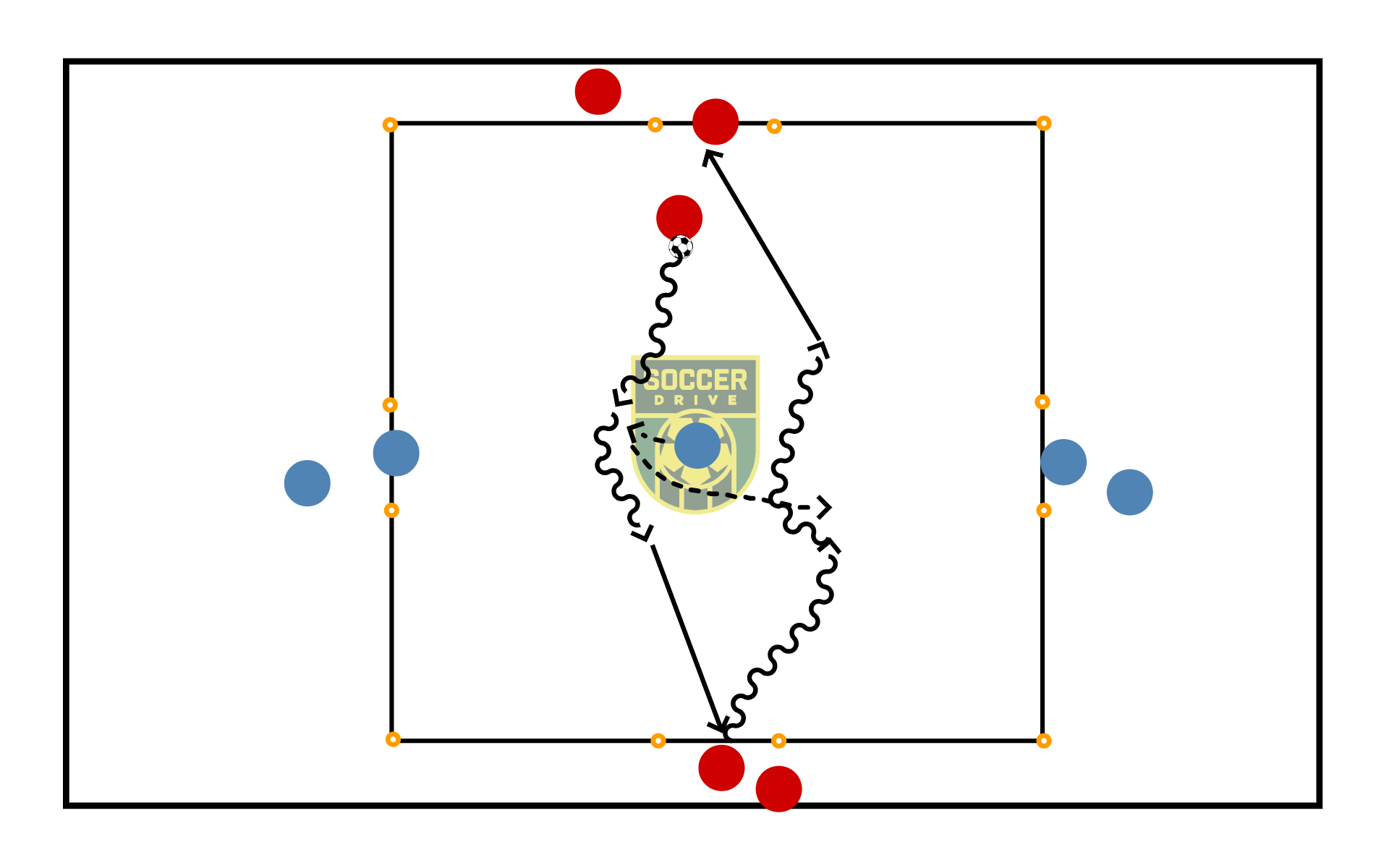 Team starts with the ball and will play 1v1 with opposite team and will try to fake him out and make a pass to his teammate.
