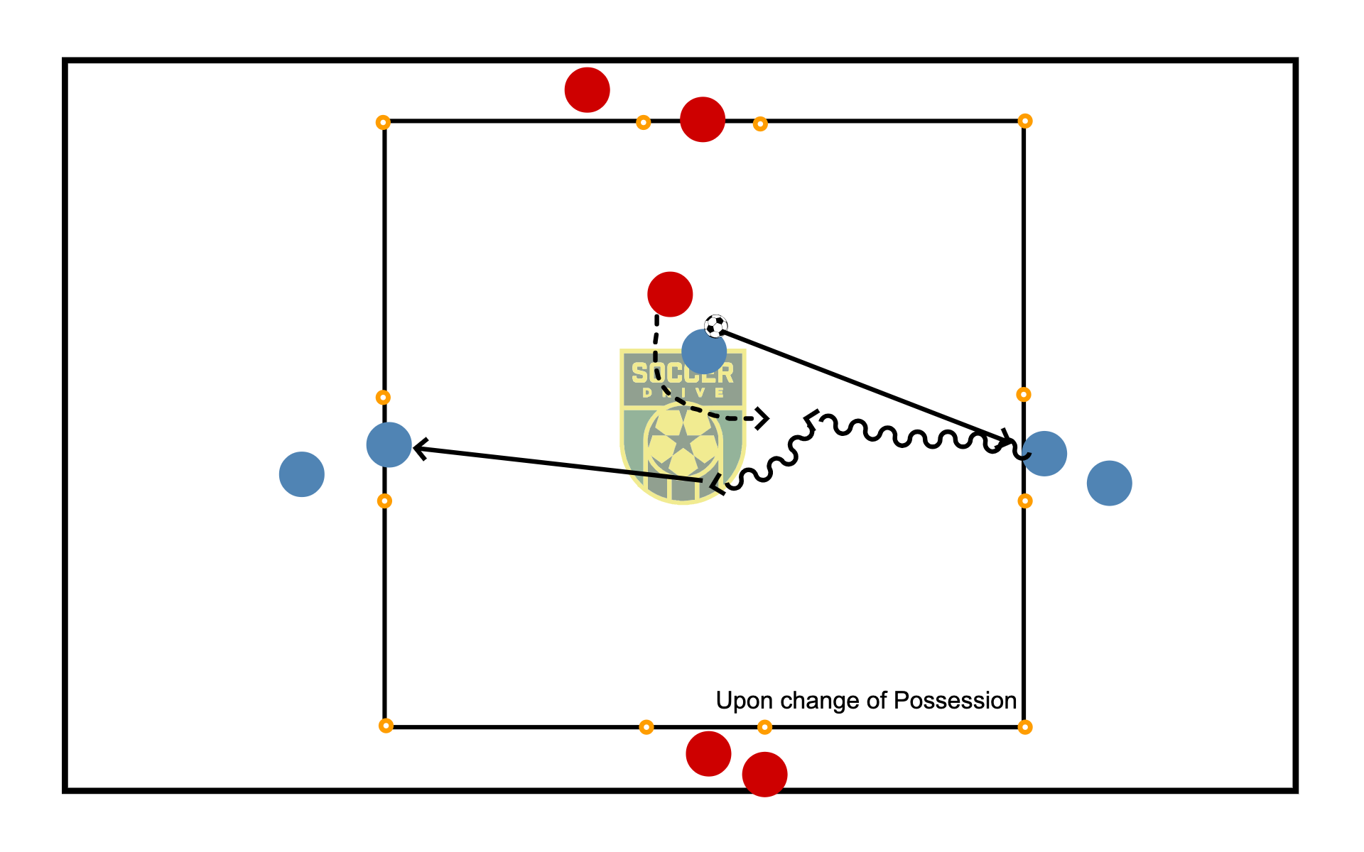 If one team loses possession, the other team will continue the process until change of possession again.