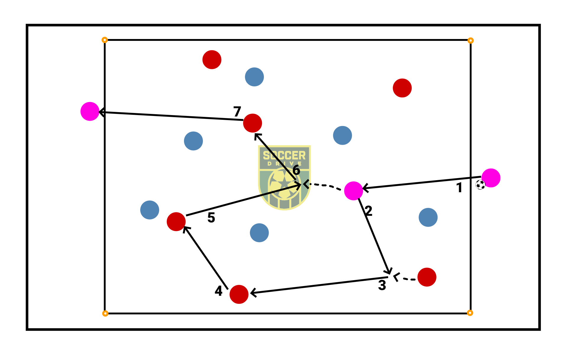 (In possession) Connect 7 times, play from goalie to goalie for a point. (Out of possession) Recover possession and play out of press (keep the ball). Focus on the defensive organisation. Shift together, squeeze the pitch as much as possible, close inside, force outside, …