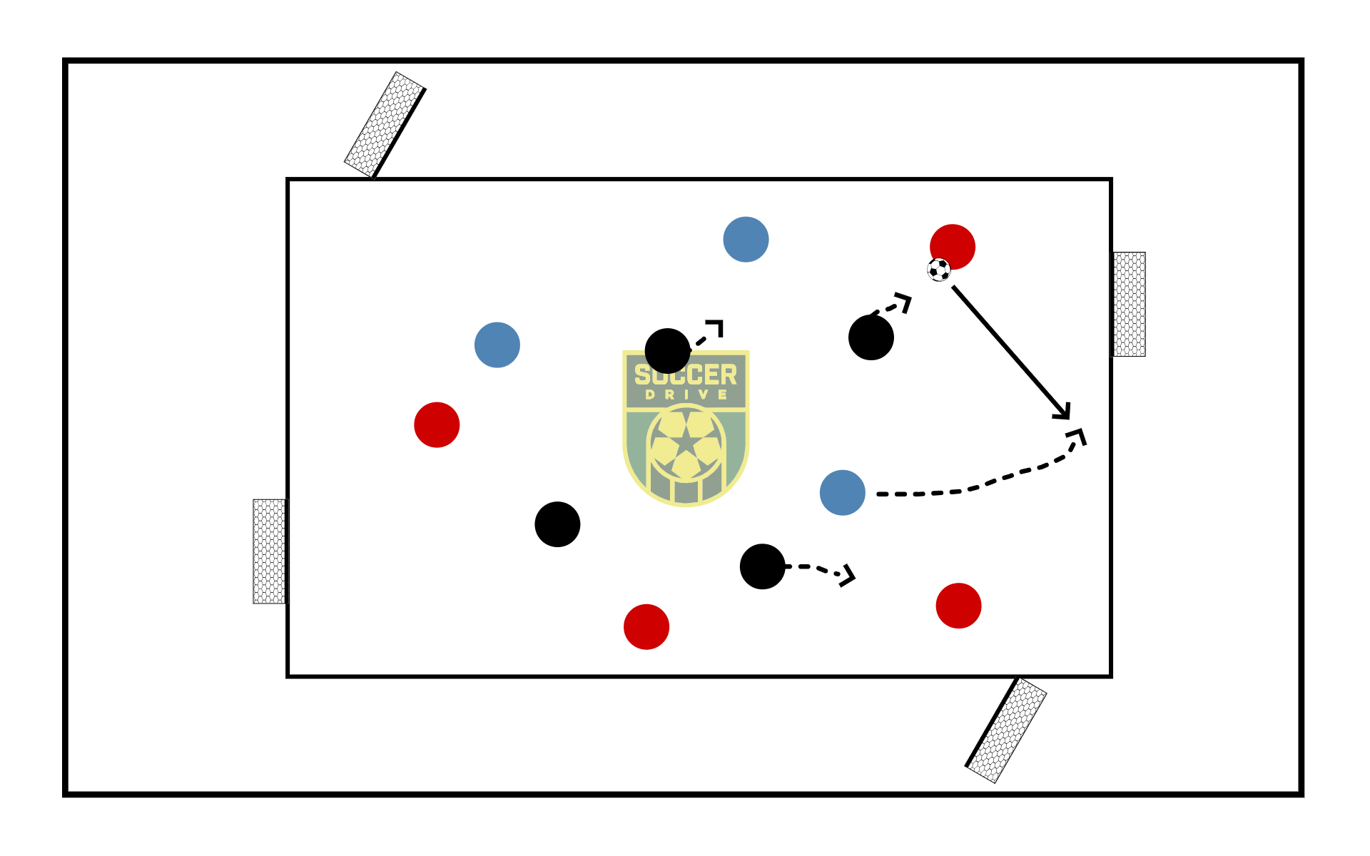 4 defenders (black)trying to steal the ball and score in one of the 4 small goals