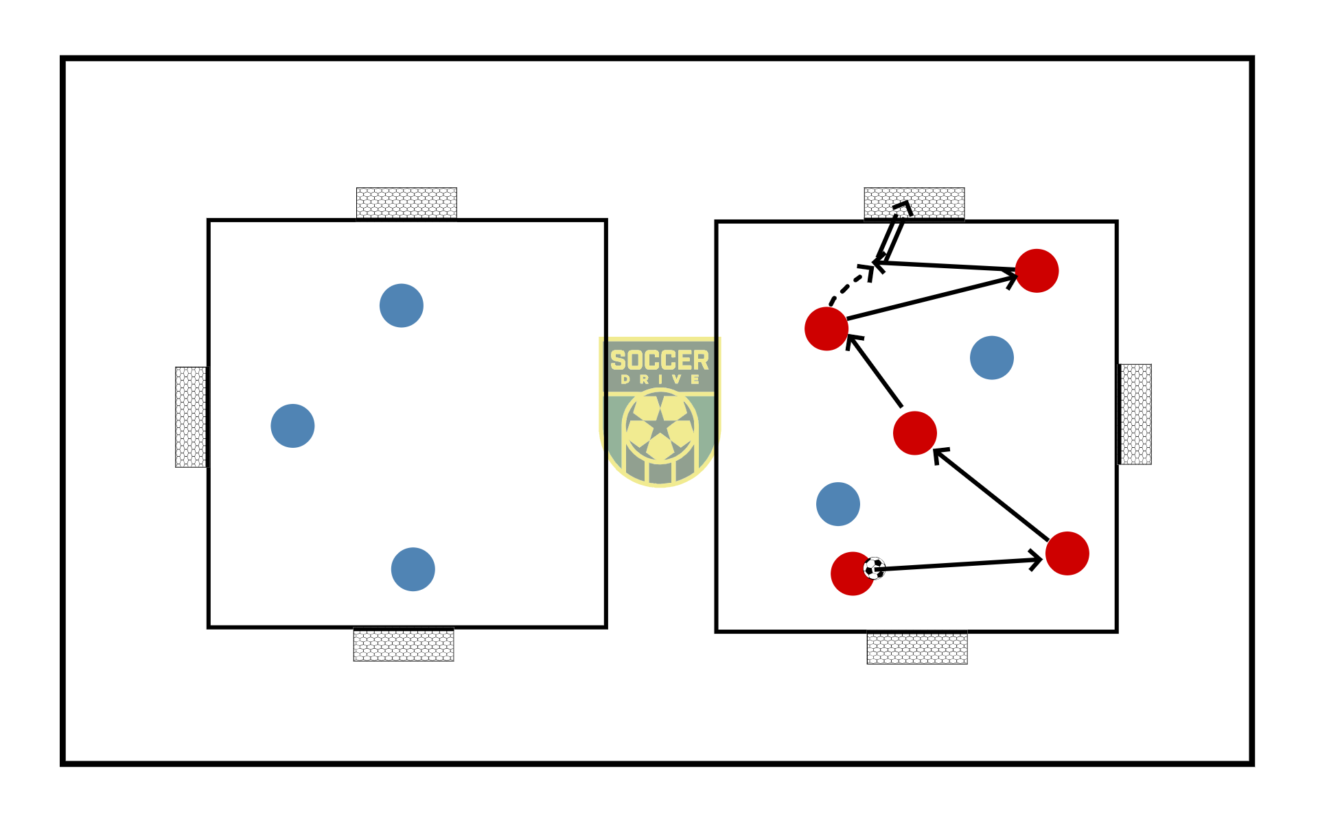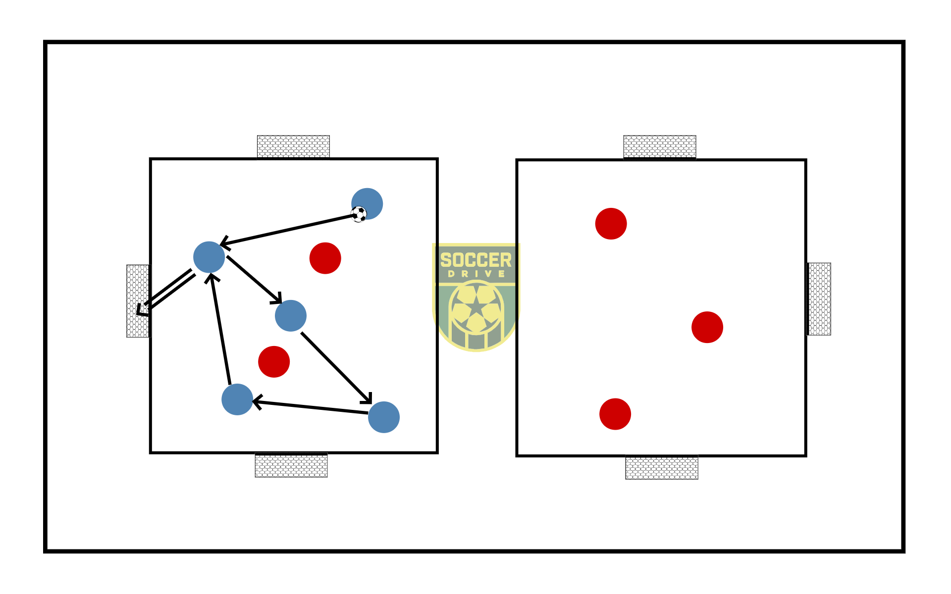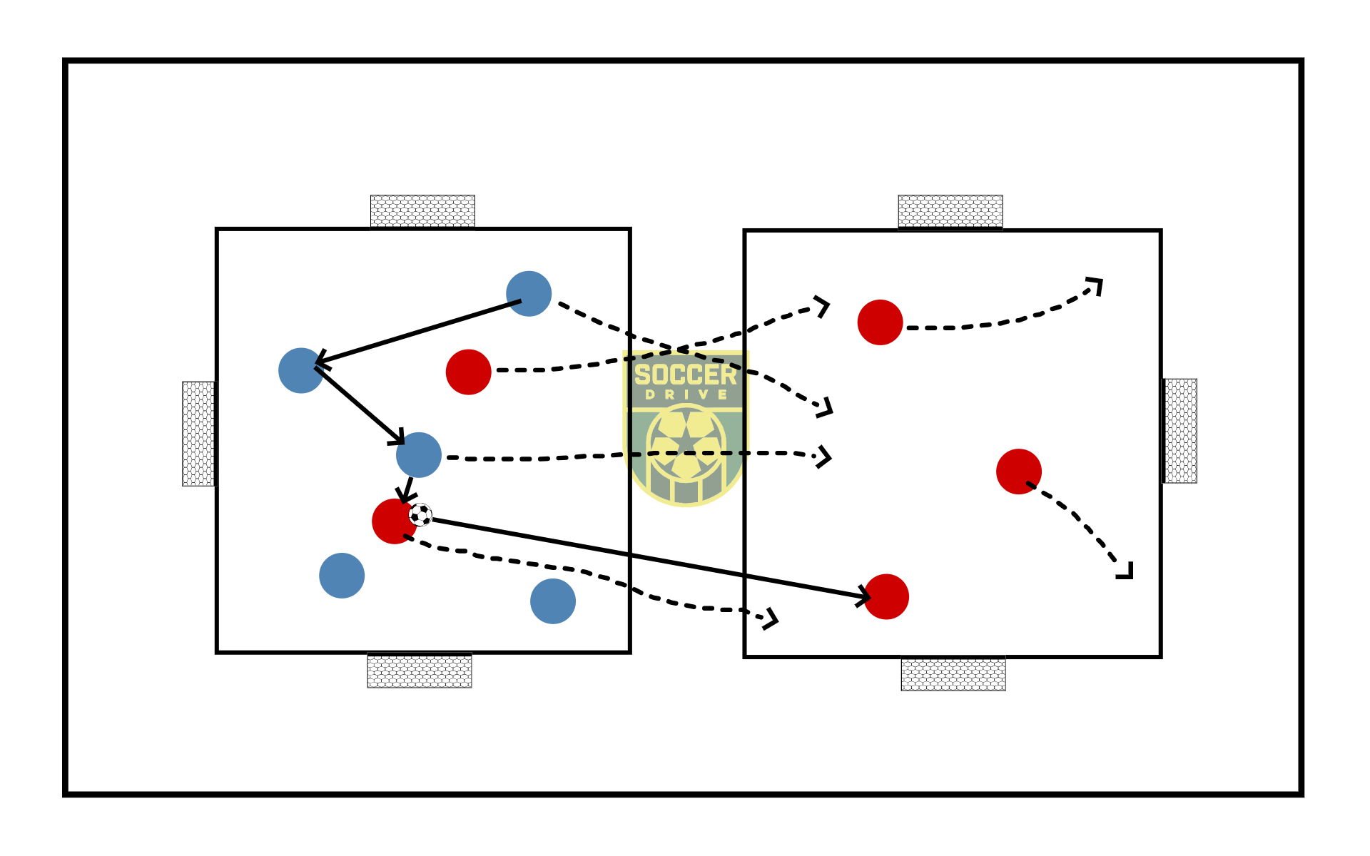 If Team 2 gets possession they can switch the ball to their square where they now will play 5v2 for (5) passes before scoring