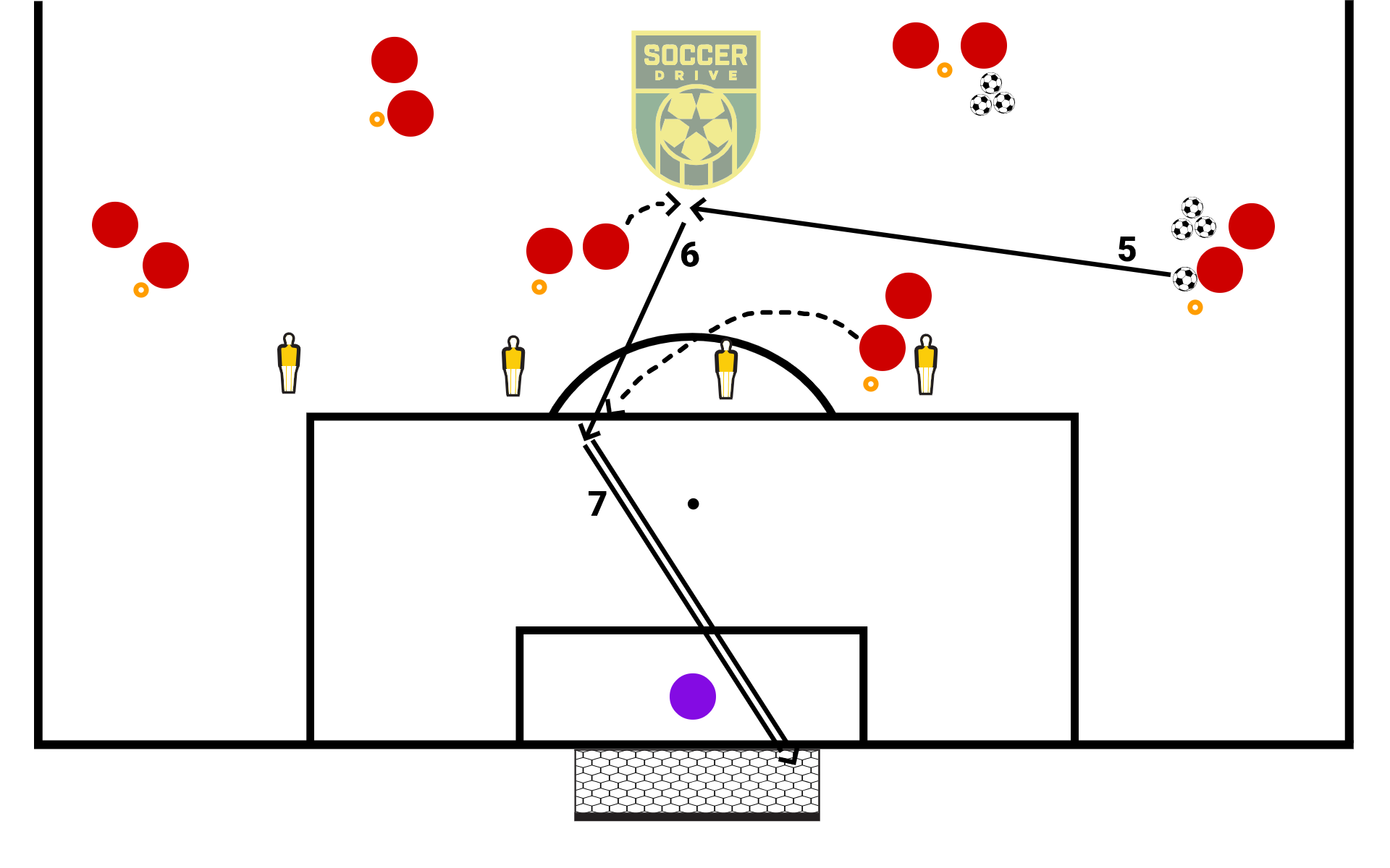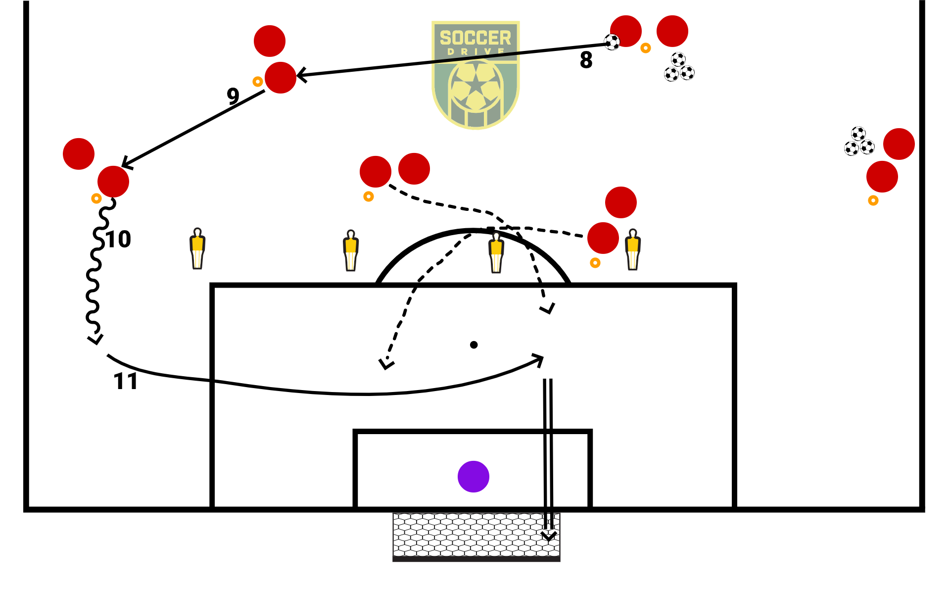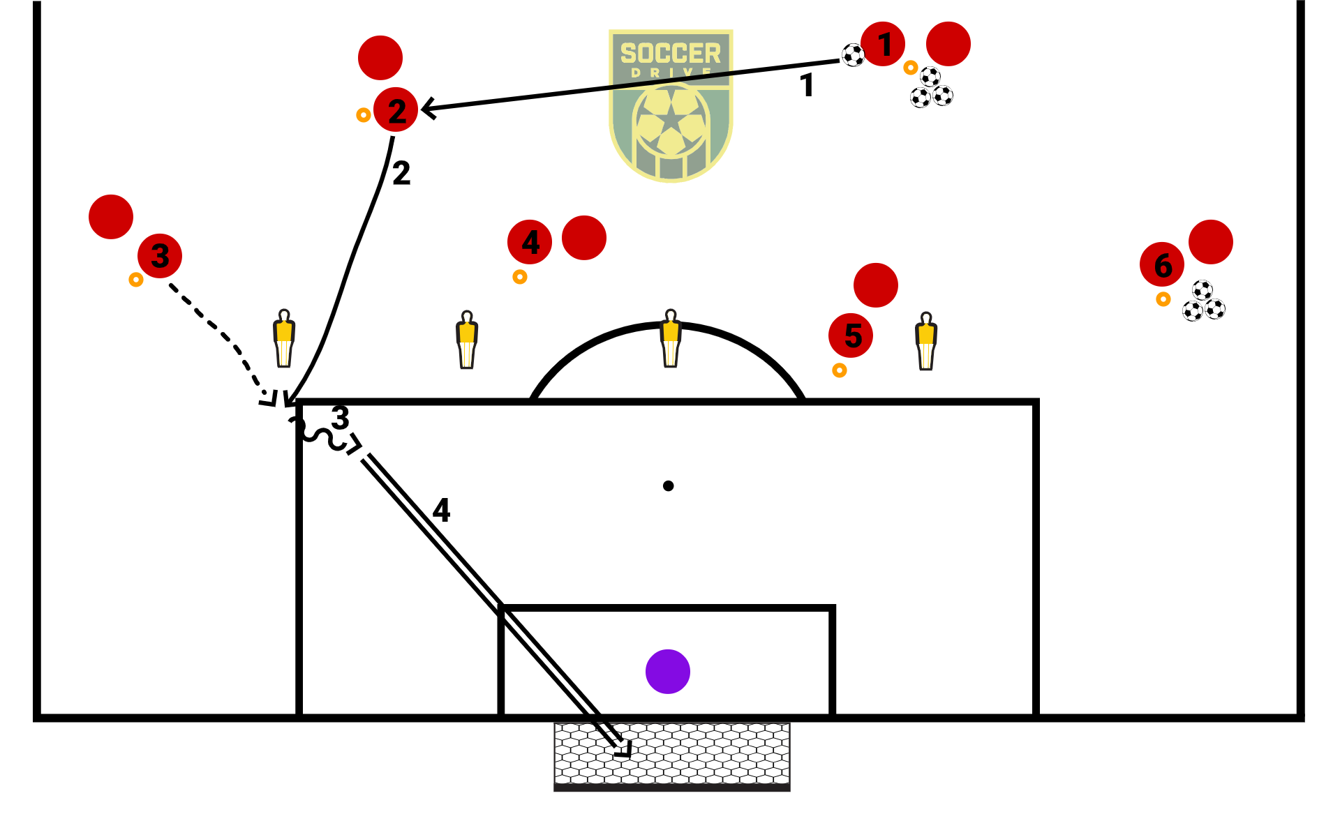 1️⃣ Winger receives and plays back, then goes 1v1 with the keeper. 2️⃣ Midfielders link up and play a deep pass to the striker another 1v1 chance. 3️⃣ Winger finds the attacking midfielder running deep. Cross into the box for the striker and other midfielder, who switch zones before finishing.