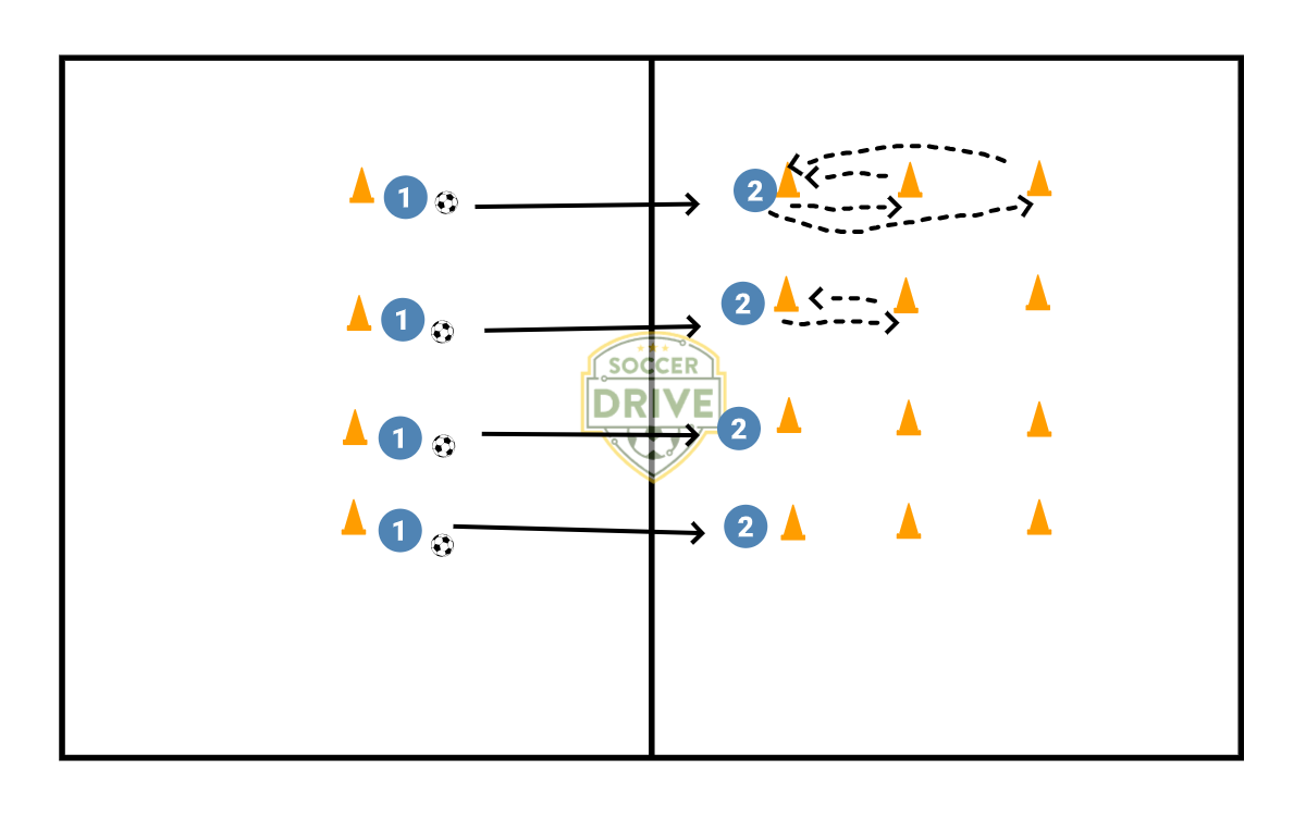 Drill focuses on repetitive passing while using good technique and also conditioning.