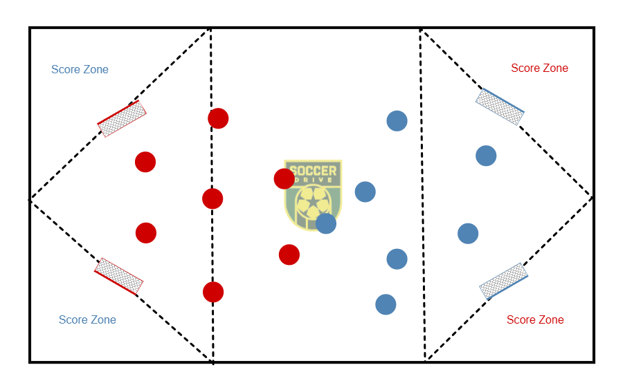 The pitch is split into three zones with four mini-goals located at diagonal lines, facing away from the field