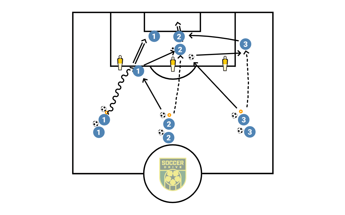 First line dribbles to the pole and takes a shot, then turns and plays a 1-2 with the 2nd line who then shoots. After the 2nd shot, player 2 turns and plays a 1-2 with the 3rd line out wide, who crosses to player 1 & 2 for the finish. Rotate to the right, then switch sides.