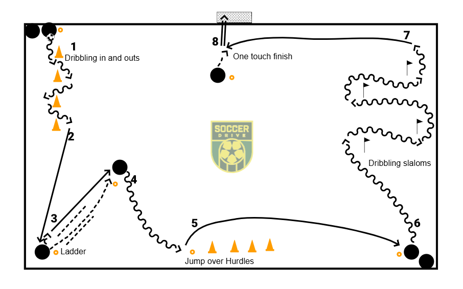 - 3rd step is dribble toward hurdles and cross ball to next station then complete the hurdles