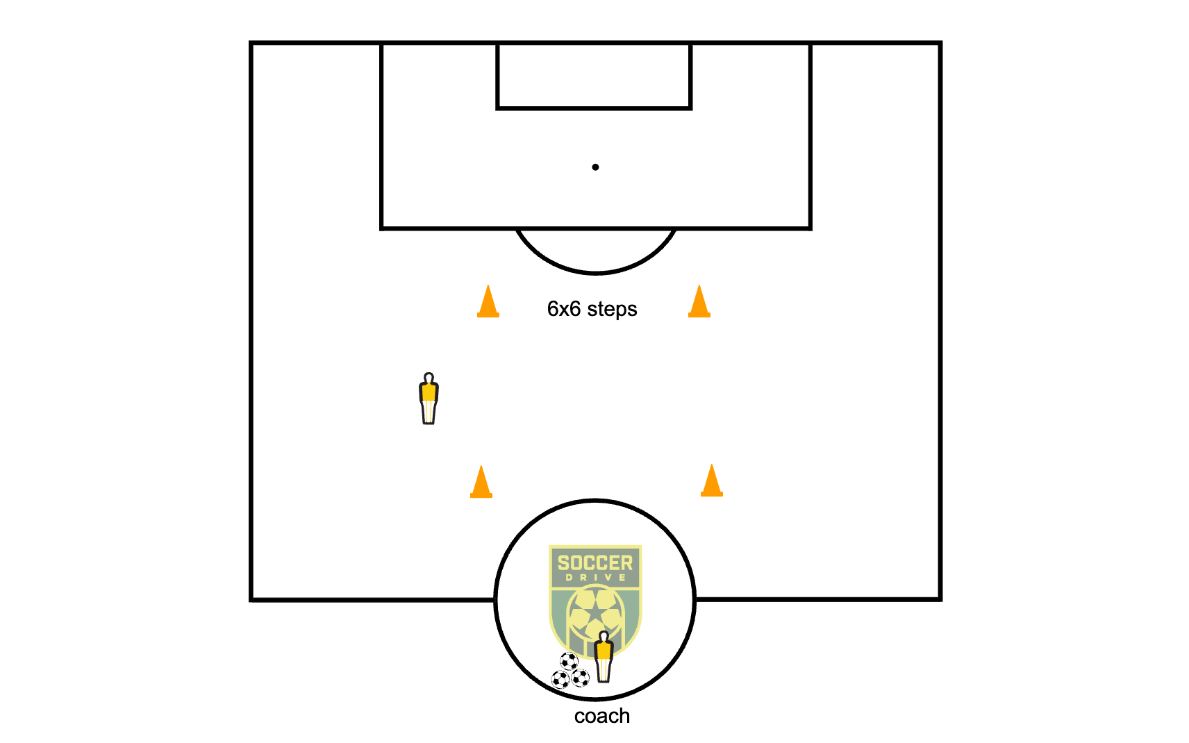Notes from creator: Start outside the box. Make a quick movement to receive inside the box. You have max 2 touches (control, adjust if needed, and shoot)! Use both feet and switch sides.