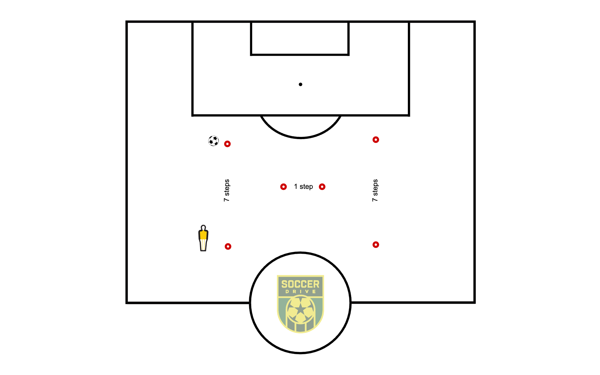 The player will sprint to the first cone, perform a skill at the middle gate, get around the back cone, and add a 1v1 move at the last cone.