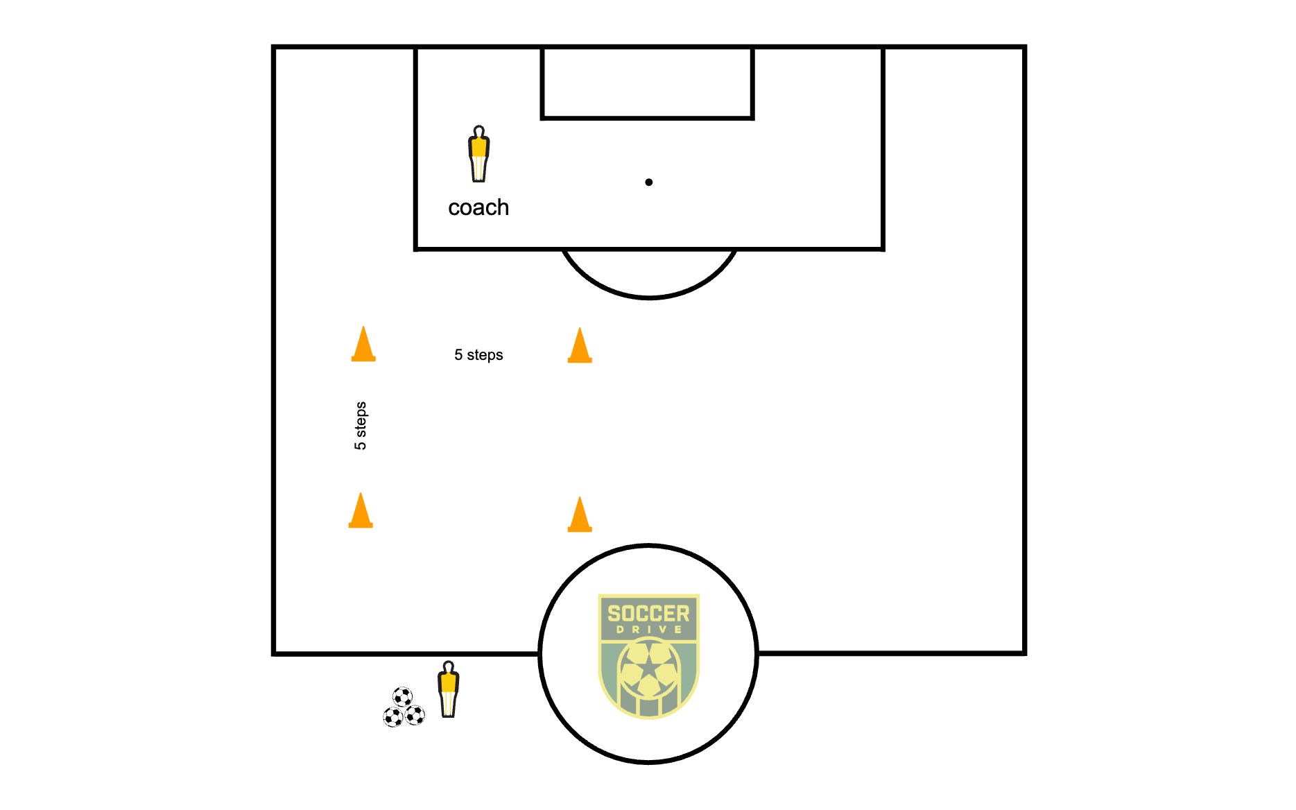 The player will start by dribbling into the box. Then receive and bounce pass, and perform one of the first touch patterns out of the square, and take a shot on goal.