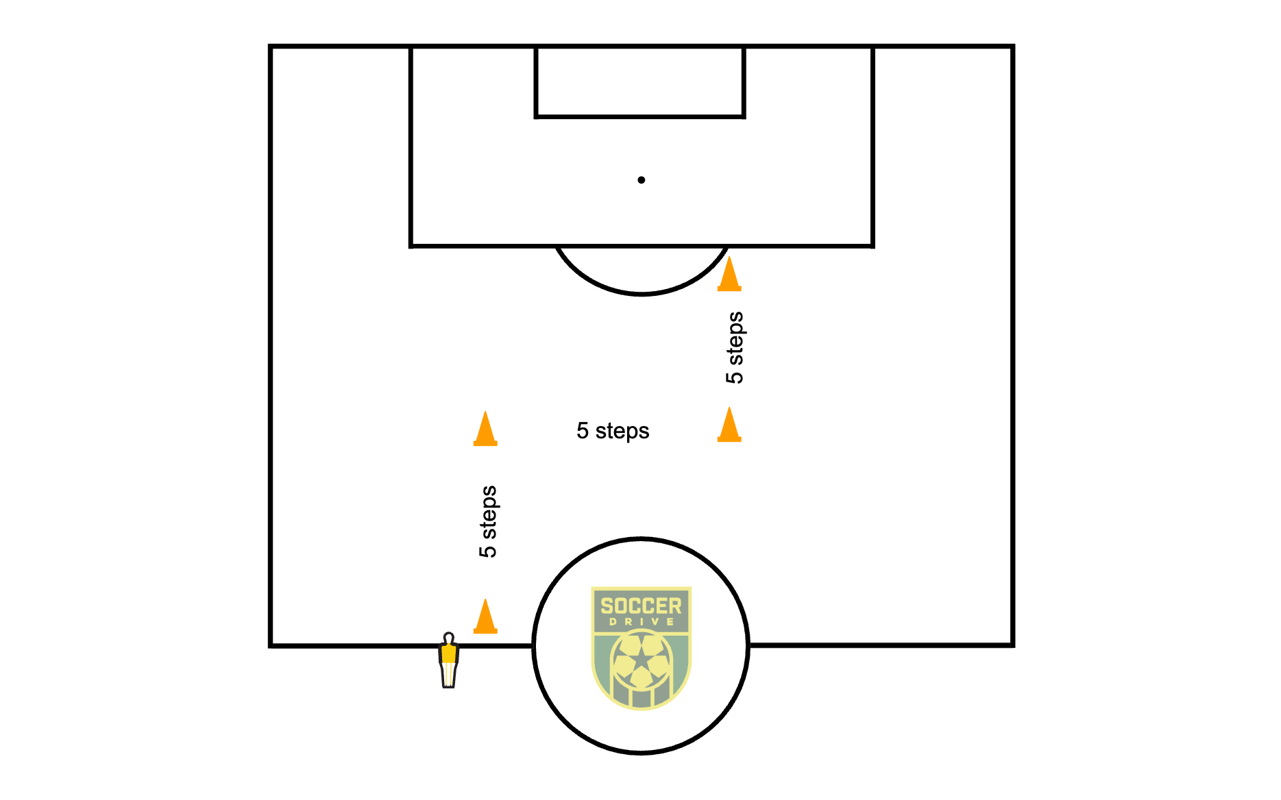 The player will dribble at each pole/cone and perform a shift or feint. Once past the last pole/cone the player will shoot on goal.
