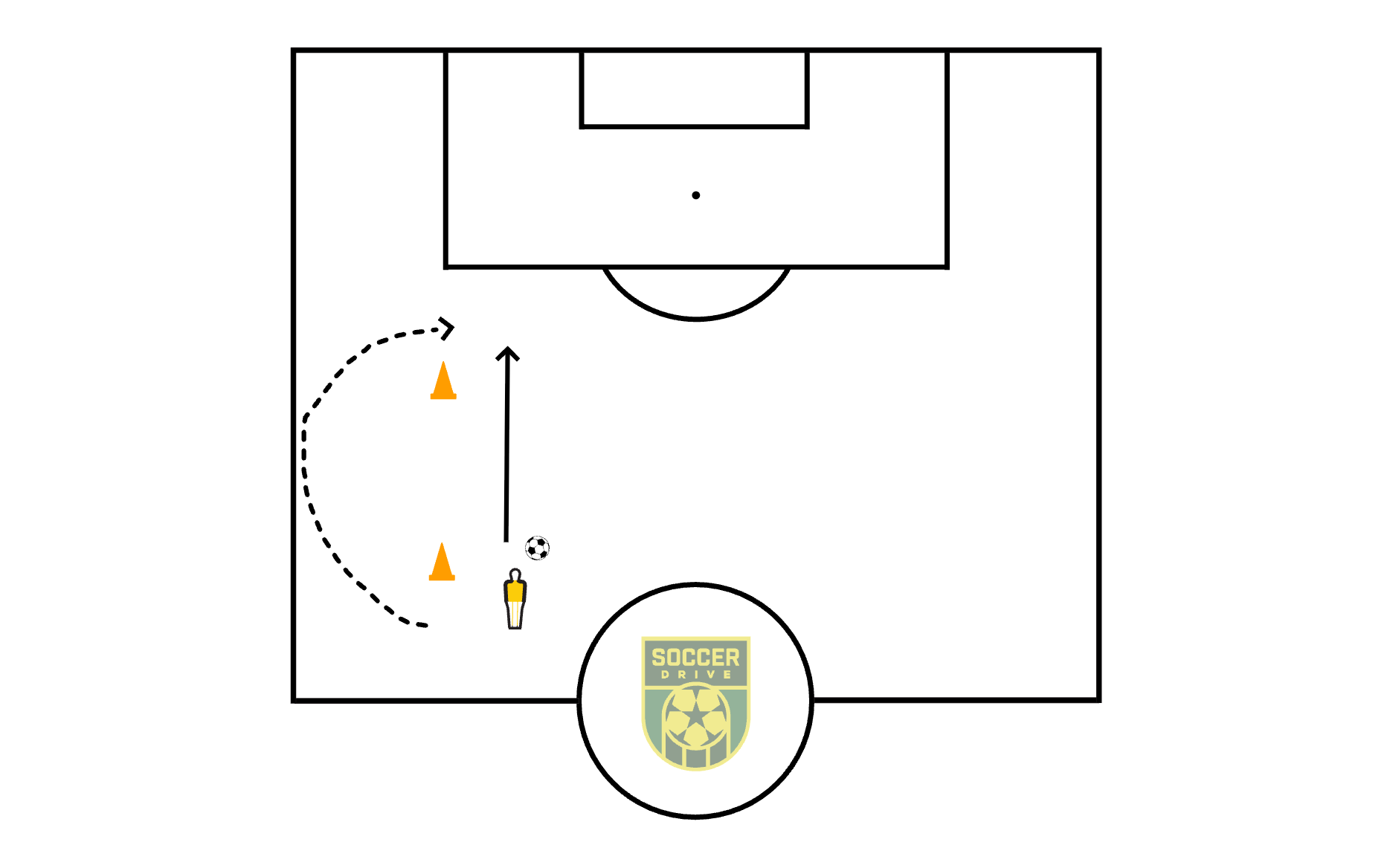 The player will pass a through ball to themselves, run around the cone to finish across the goal—great drill to work on how to set/weight the ball to finish.