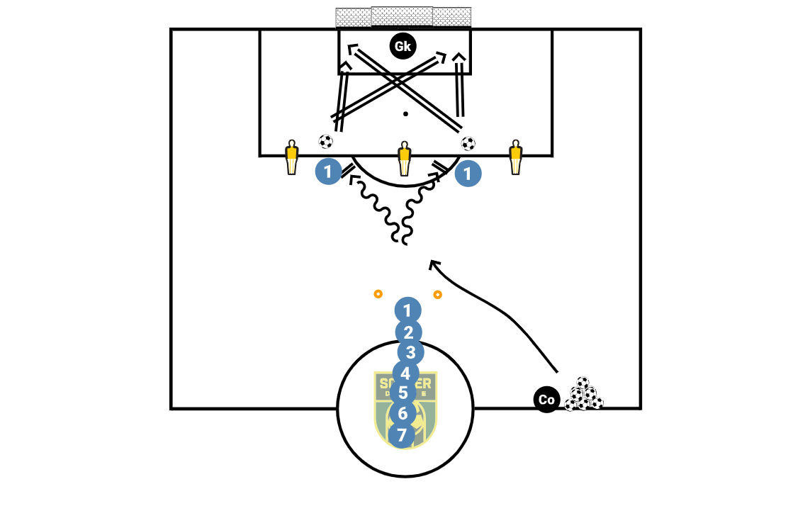 Coach will give a weighted pass through to the players for the players to receive it and take on the cones that will represent as players and their goal is to dribble around them and take a accurate shot towards the goal.