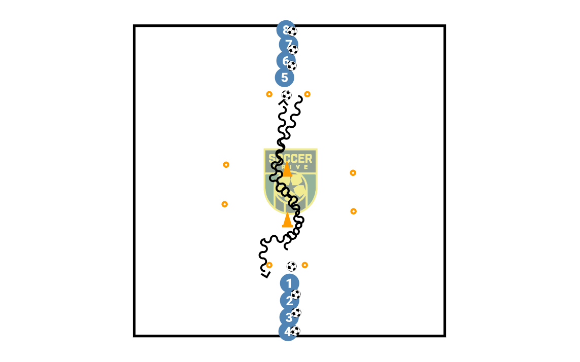 Players will grab a ball and do a ball roll over through the cones in the middle and then precede to the back of the line on the other side.