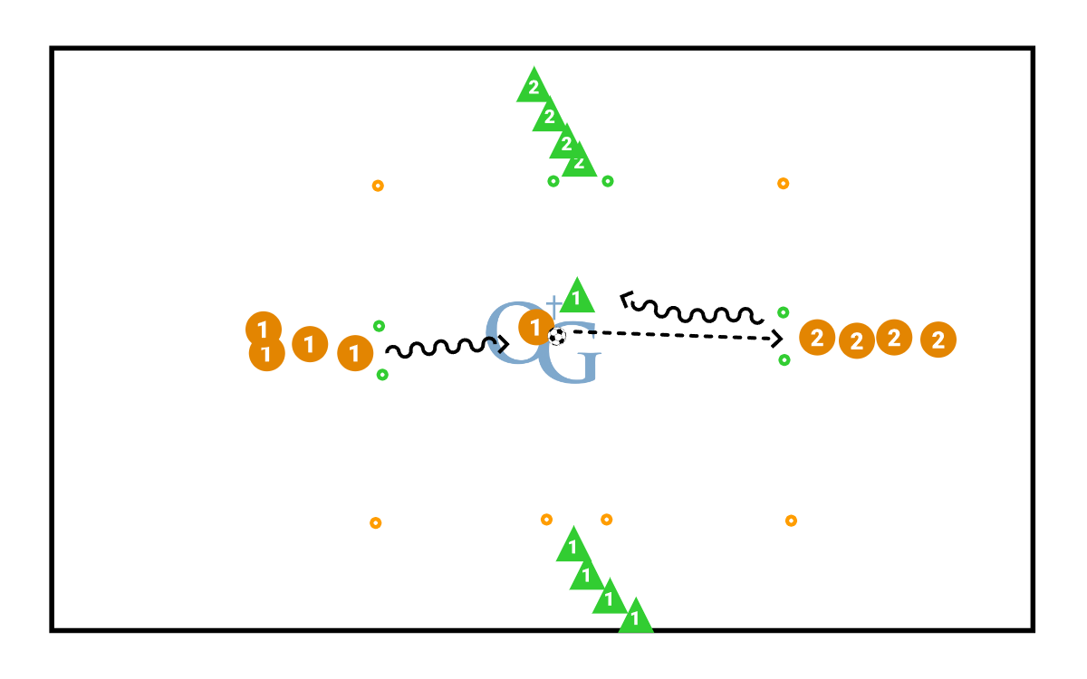 Player dribbles in and challenge 1 v 1 if he wins he passes to opposite side after beating defender. Defender stays