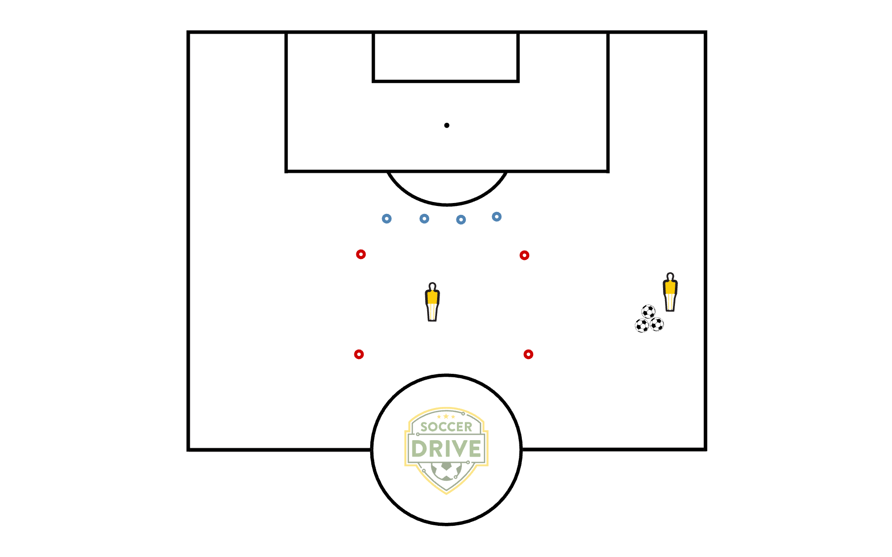 The blue cone represents a defender. The player will take their first touch through either gate to finish.