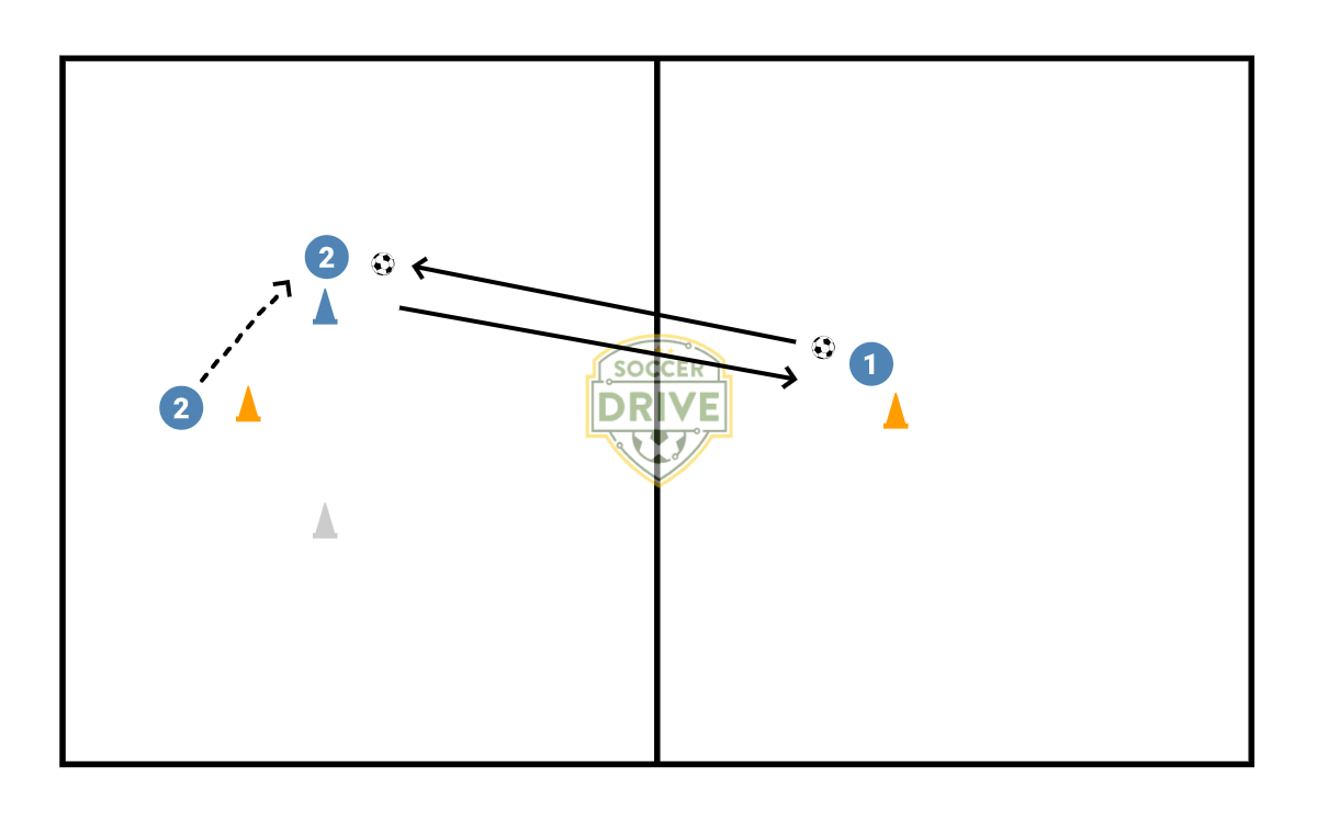 Player 1 calls out a color and passes to that cone, player 2 must receive and pass back with 1-2 touches. Go for 30-45 seconds then switch. Rotate 3 total times for each player.