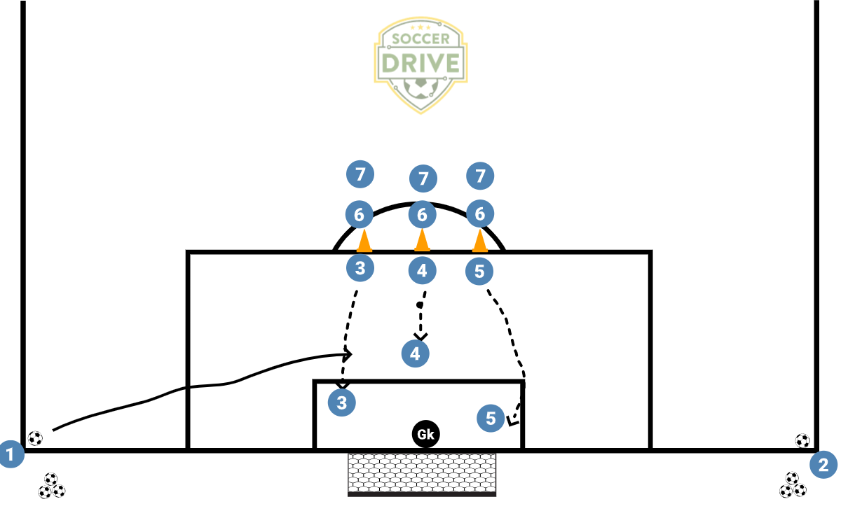 Practicing finishing on corner kicks. Have someone taking corners from each side. Three cones at the top of the box. The line closest to the corner where the ball is kicked from runs near post, middle cone goes to the PK spot and furthest cone makes a curved run to the back post. Once the ball is kicked everyone attacks the ball quickly. Alternate the side the corner comes from and keep everyone in the same line. Once everyone has gone through 3-4 times, rotate each line to a new cone. Alternate the person taking the corner kick.