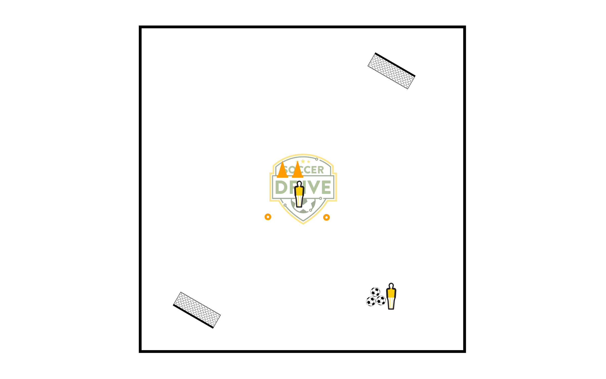 The player will check in, first-time finish in the front goal, and half-turn finish in the back goal.