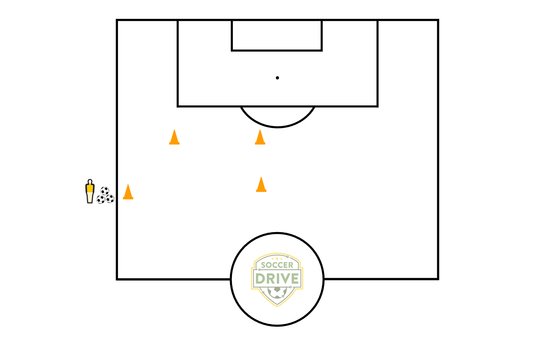 Coach will pass the player the ball. They will receive and dribble around the first cone. Wall pass with the coach and then finish.
