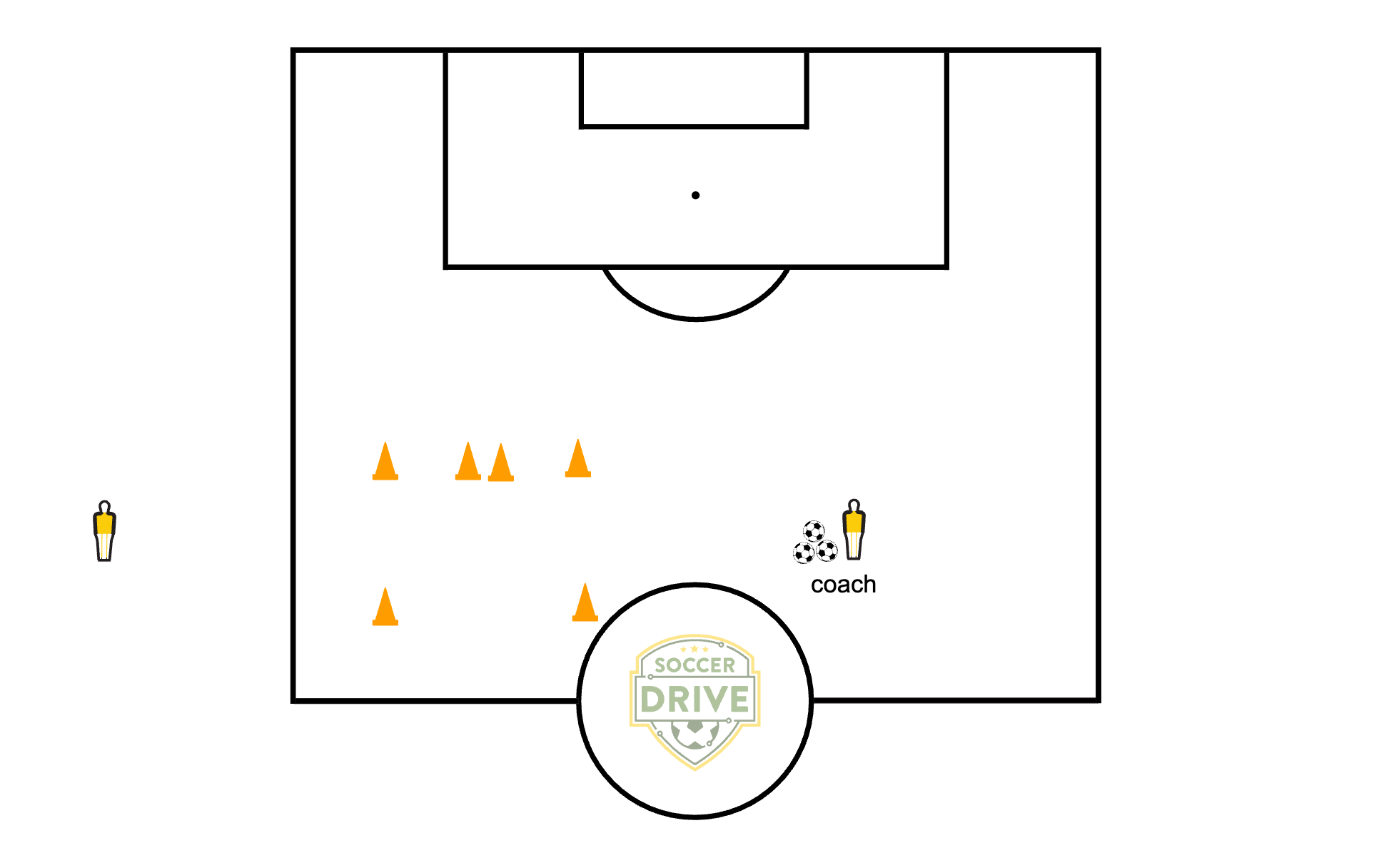 The player will check into the box and receive the ball. Then take their touch past either side of the two tall cones and finish.