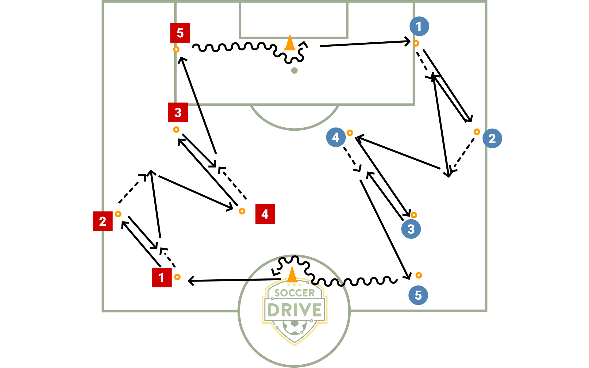 Joueur 5 dribble vers le cone, fait une feinte (feinte, passement de jambes, roulette, ... ) et passe au joueur 1 bleu