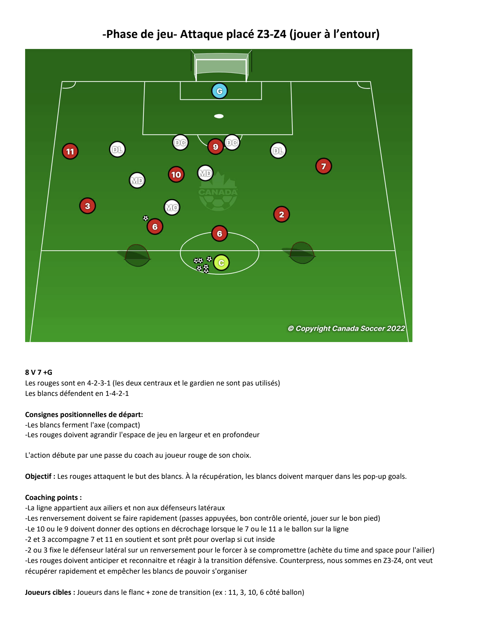 -La ligne appartient aux ailiers et non aux défenseurs latéraux -Les renversement doivent se faire rapidement (passes appuyées, bon contrôle orienté, jouer sur le bon pied) -Le 10 ou le 9 doivent donner des options en décrochage lorsque le 7 ou le 11 a le ballon sur la ligne -2 et 3 accompagne 7 et 11 en soutient et sont prêt pour overlap si cut inside -2 ou 3 fixe le défenseur latéral sur un renversement pour le forcer à se compromettre (achète du time and space pour l'ailier) -Les rouges doivent anticiper et reconnaitre et réagir à la transition défensive. Counterpress, nous sommes en Z3-Z4, ont veut récupérer rapidement et empêcher les blancs de pouvoir s'organiser