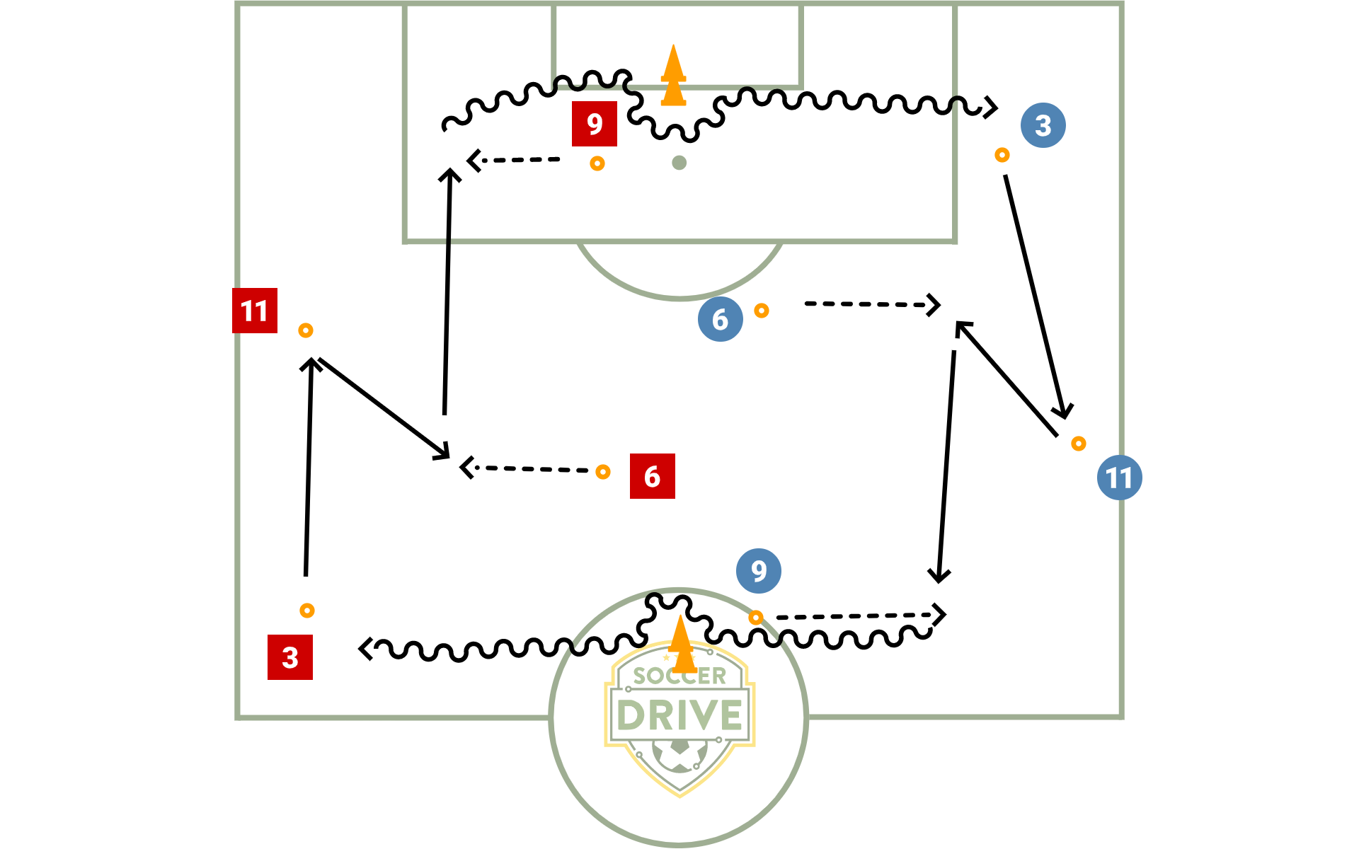 Joueur 11 pass en retrait au joueur 6 qui decroche.