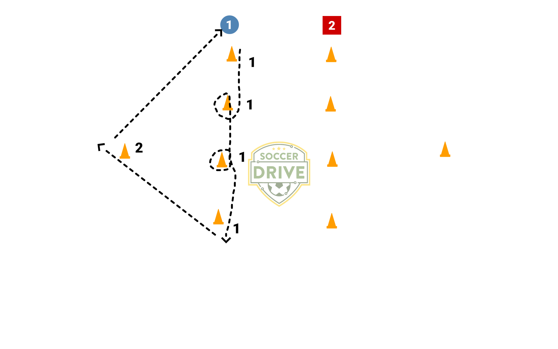 les joueurs progress ver les cones 1 en joggant et les contournant vers l'exterieur