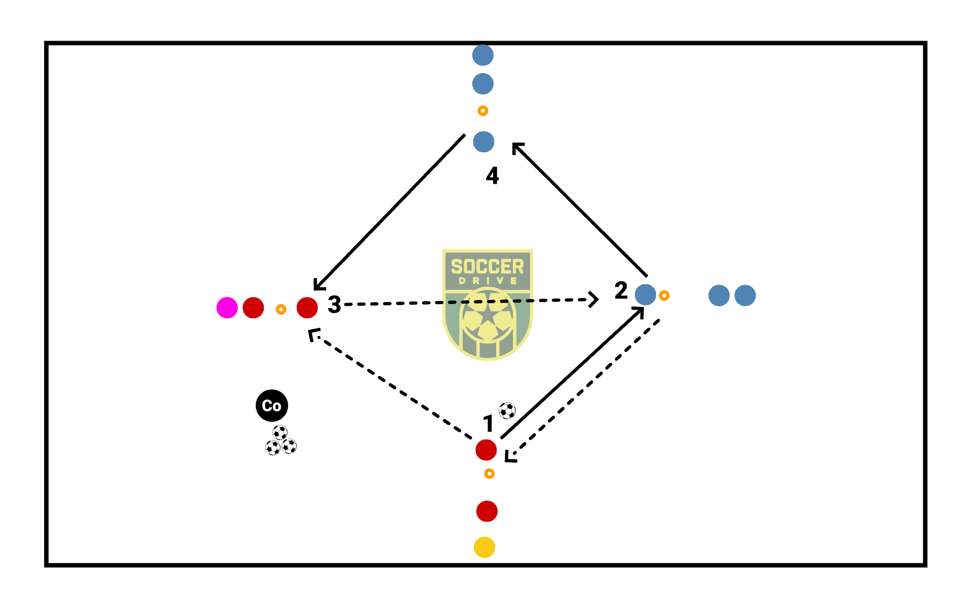 Les joueurs font une rotation en allant de l'autre cote ou il n'ont pas passe le ballon le ballon ( Dans cette exemple le joueur 2 a fait la passe au joueur 4, donc il doit aller se placer de l'autre cote au joueur 1)