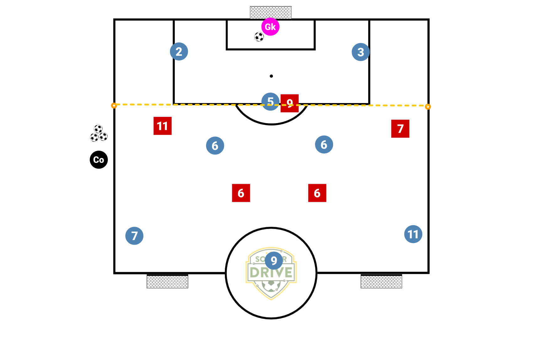 Le ballon demarre au gardien qui doit joueur court. Les cones jaunes servent de ligne de retrait. Les rouge ne peuvent pas traverser jusqu'a temps que le ballon soit joue.