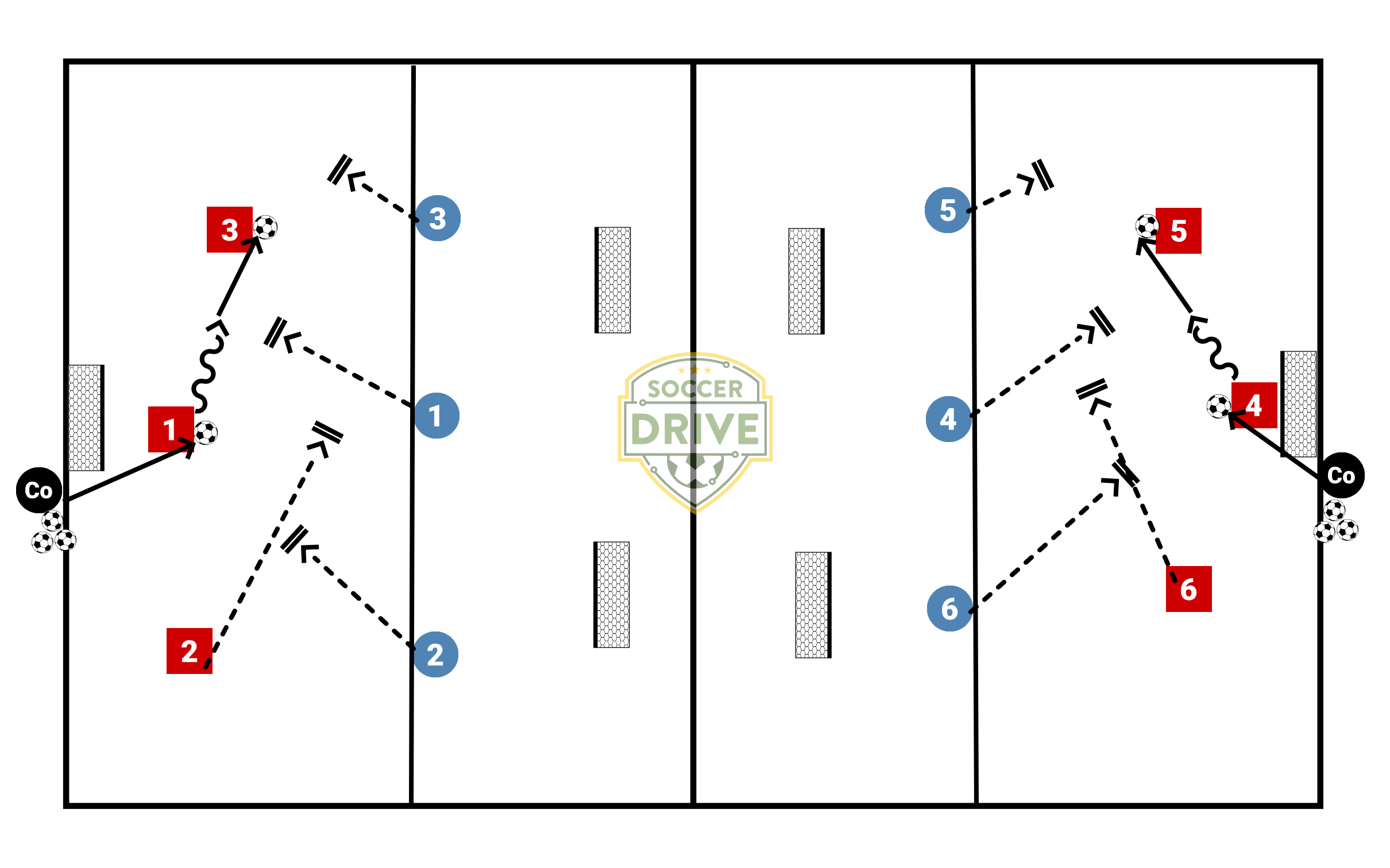 Coach, like a goalie, throws ball into one of three backs. Mids wait at buildout line until coach releases the ball. Backs must pass the ball three times before attempting to score on either small goal. During passes, mids must press backs, but delay, not able to take the ball accept by stealing a pass. After third pass, mids press to take away ball and score. Backs are essentially playing a game of rondo while moving the ball up the field. Mids should take turns pressing and supporting: center mid presses center back as they move right, right mid supports. Right mid presses right back after receiving pass and center mid moves into support. Always communicate to call teammate into support so press does not fall apart. Outside mid goes in to close down space, center mid comes in at angle to force ball to sideline and outside mid.