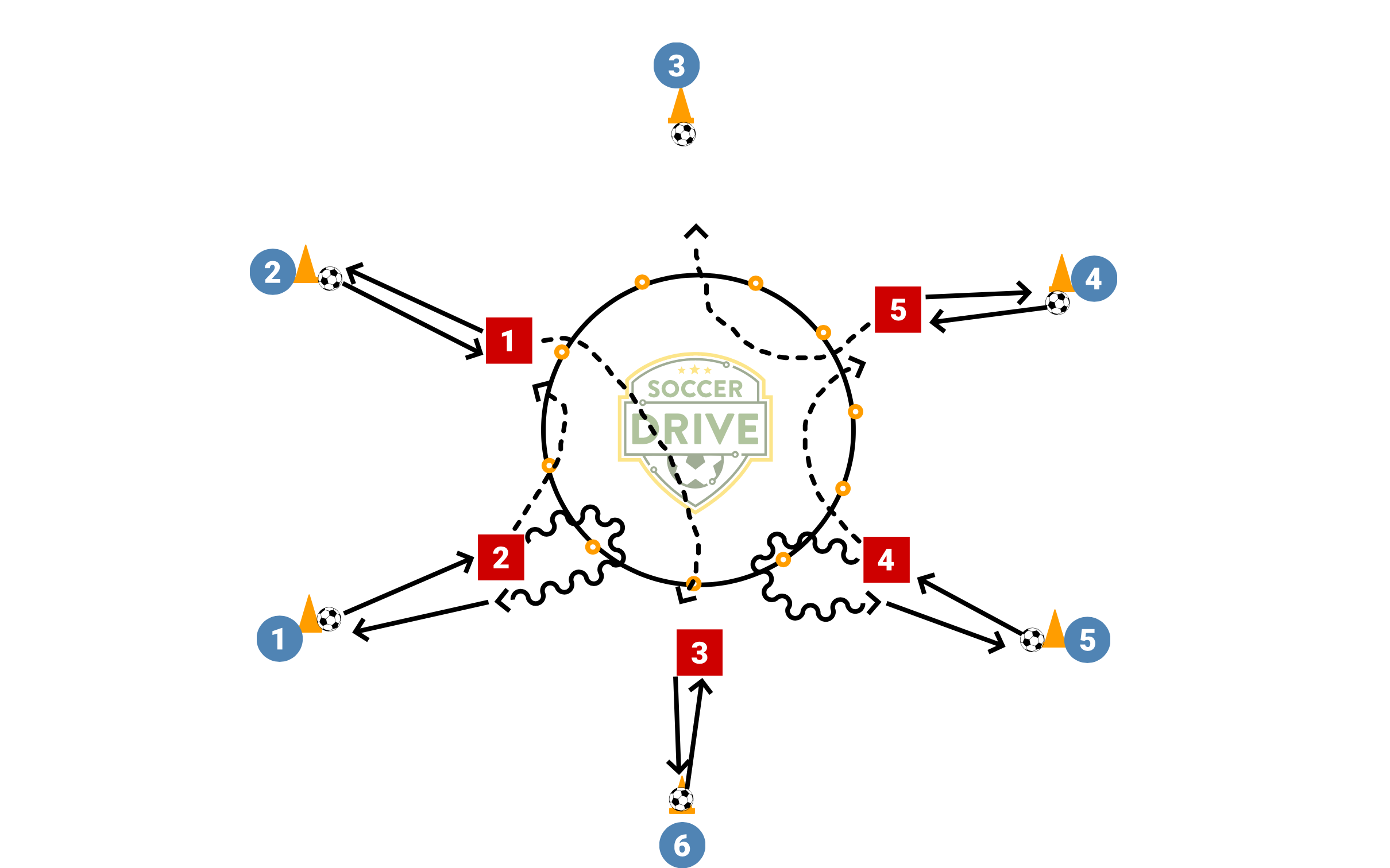 Each blue player at cone has a ball. Red players run into the magic box which spits them back out at high speed as they sprint to receive a pass from a blue player. As they approach blue, they yell the teammates name. The blue player makes a quality ground pass and either yells out "Time!" or "Man On!". If they yell "Time!", the red player stops the ball and passes back. Quality first touch and pass - two touches. If the blue player yells "Man On!", the red player knows there is a defender them and plays a one touch wall pass back to the red player. Every time a pass is played back to a blue player, the red player sprints back into the magic box which spits them back out at high speed to another blue player. 5 minute rounds and switch teams.