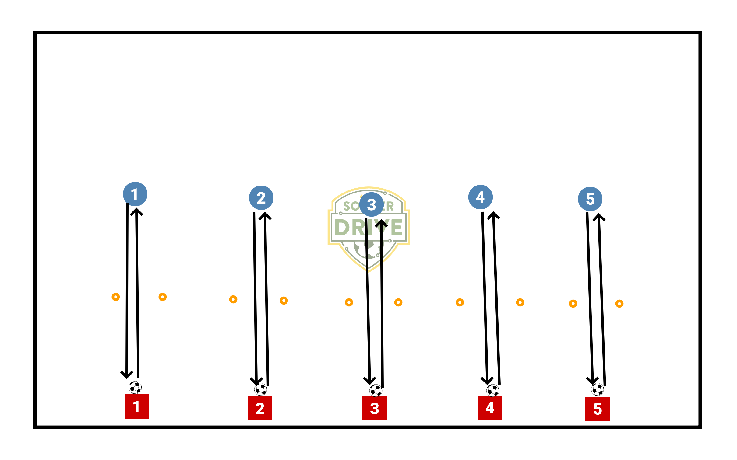 Warm up passing drill. Pairs of players stand equidistant from the cones. They work first on quality, two touch passes between gates. Focus is on quality: proper technique, weight of kick, on the ground, accuracy, correct first touch. Progressions: -Right foot only -Left Foot only -One Touch -Put cones together, pass in rectangle around middle - pass with right foot to left foot first touch to right, pass back with right foot, repeat. Switch direction