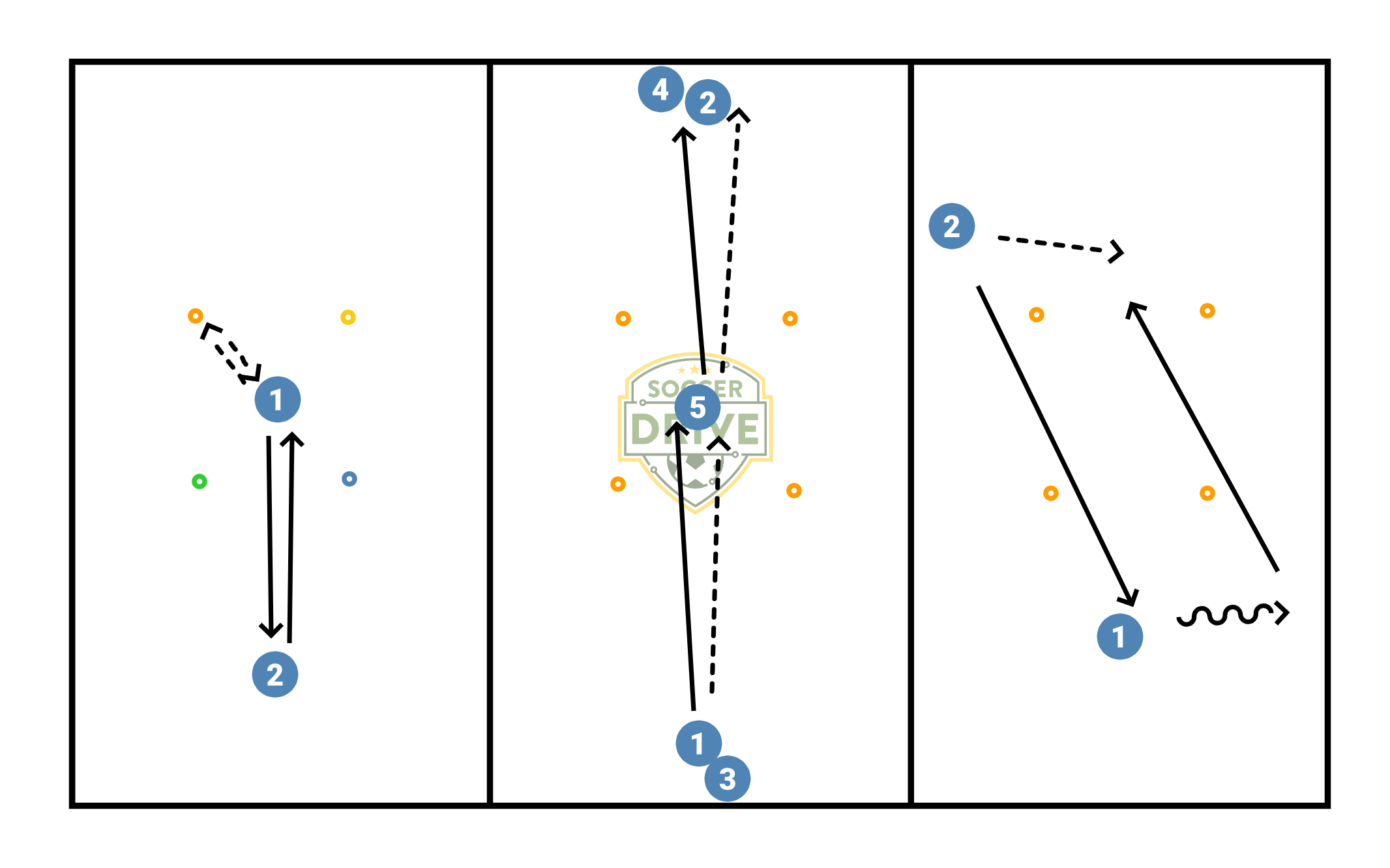 - Player 2 passes the ball to the center of the square whre player 1 will go back and pass in one touch