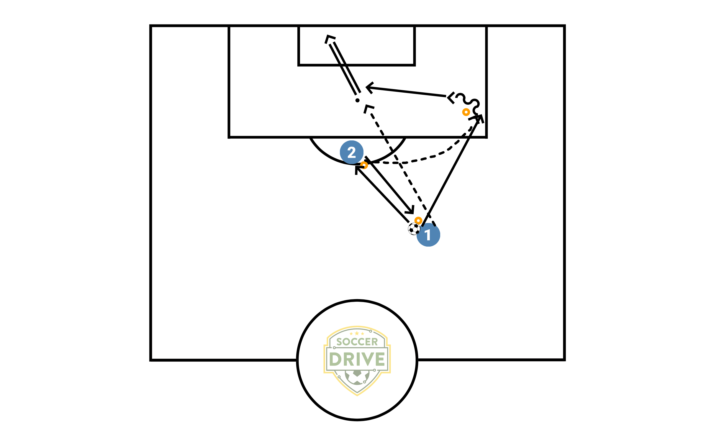 Field is set with cones as per diagram. Player 1 passes to player 2, player 2 passes back. Player two makes a run to the open cone as player 1 passes into space by the open cone. Player 1 then makes a run to the open space, between the cones, by the penalty spot. Player 2 turns around the cone and hits player 1 in stride for a shot opportunity. This is essentially a give and go drill with work on running to space.