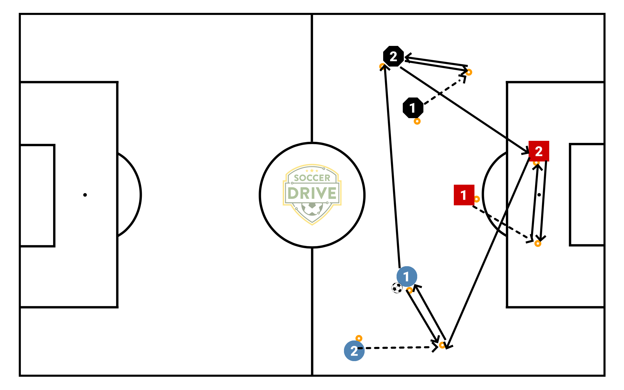 6 players in teams of 2 man positions at cones, 1 team per set of cones. Player with ball passes to pen cone where his partner runs and plays a wall pass back. First player plays long pass to open player at other triangle. Receiving player passes to open cone where their partner receives and wall passes back. First player plays long pass to different triangle and so on and so forth.