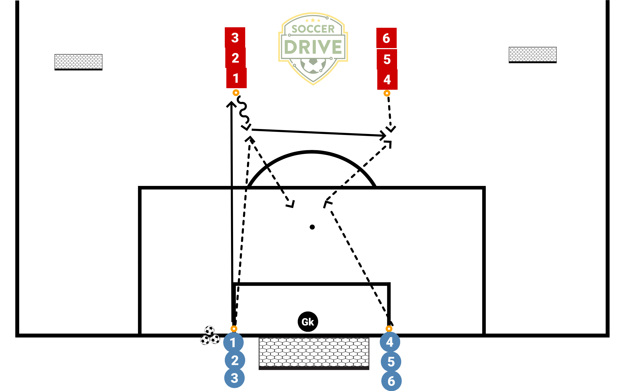 Defender passes ball to attacking player to start play. Both defenders run up, first defender to press the ball and second to provide support. When first attacker passes to second attacker, defenders switch and second defender presses the ball while first defender drops into support. Play continues until goal is scored, defense clears back up the field or ball goes out.