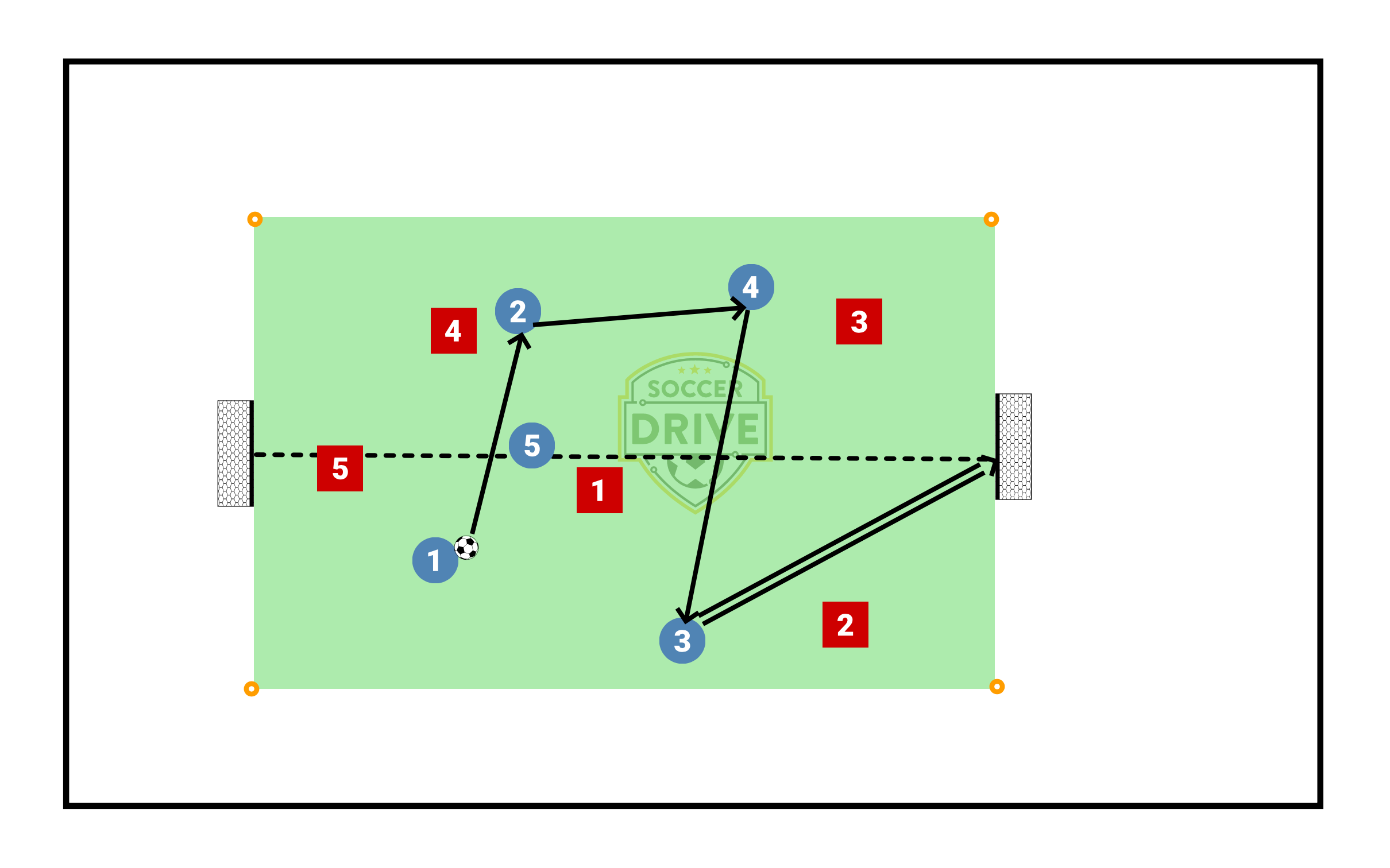 Barcelona Passing Game: Two teams with pinnies. Teams split evenly on either side of line and players cannot cross out of their side. Each team has one player that can play both sides. Teams must move around and pass the ball, counting each pass out loud. The number of passes before a successful shot is the number of points a side gets when they score. No goal, no points. No throw ins or corners, just kick ins and keep playing