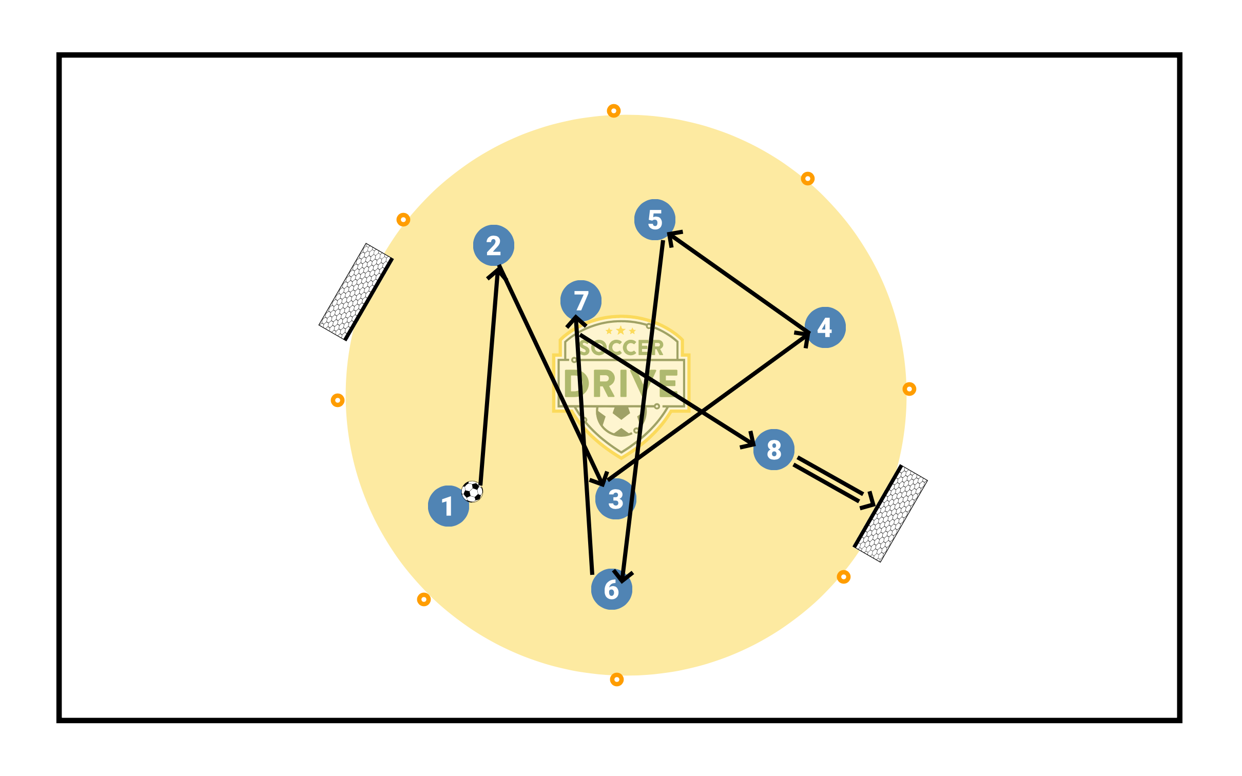 Each player is assigned a number. Players begin jogging around the circle. Player 2 yells out their number so Player 1 knows where to pass, and so on. Players must keep moving and calling out to pass through all the numbers. They are able to shoot after completing the string of passes. Each player moves up one number after each goal. This encourages moving and communication.