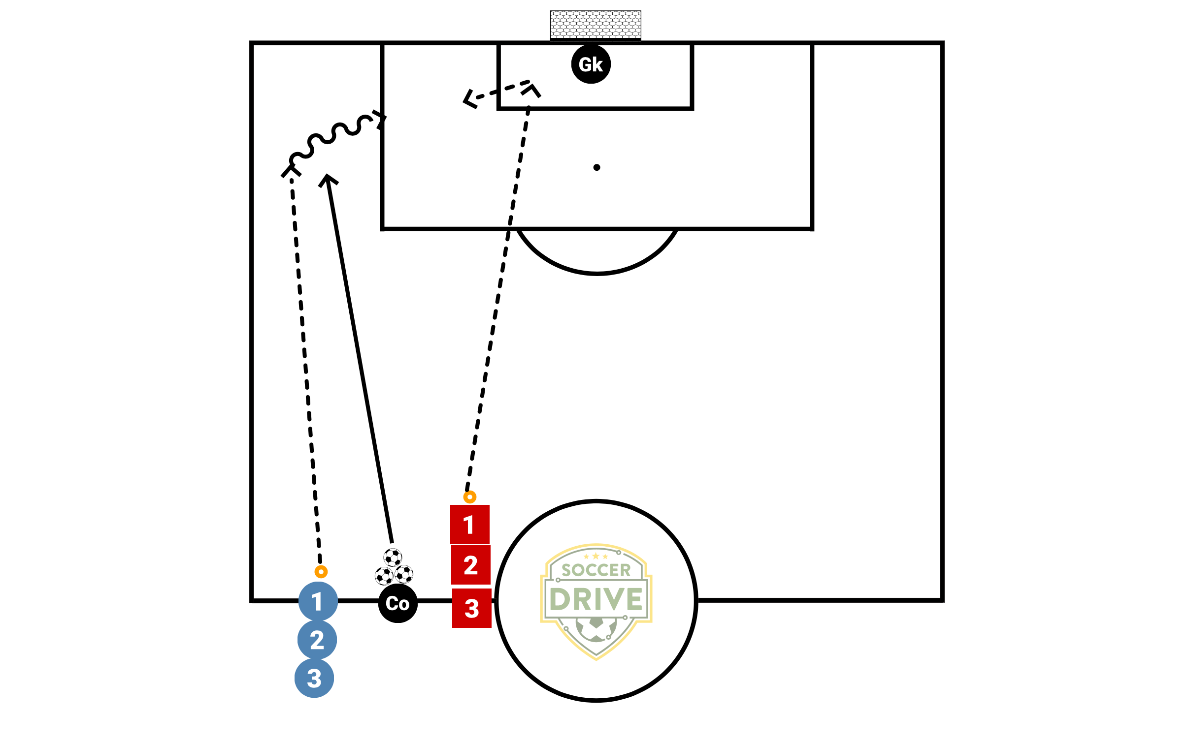 Two lines, one attacking one defending. Attack is slightly behind. Coach plays ball long down the line. Attacker chases ball down and goes to goal. Defender sprints toward near post to get into position to take on attacker. If they chase the attacker, they are out of position. Get down the field at the right angle and then turn and come out to meet attacker.